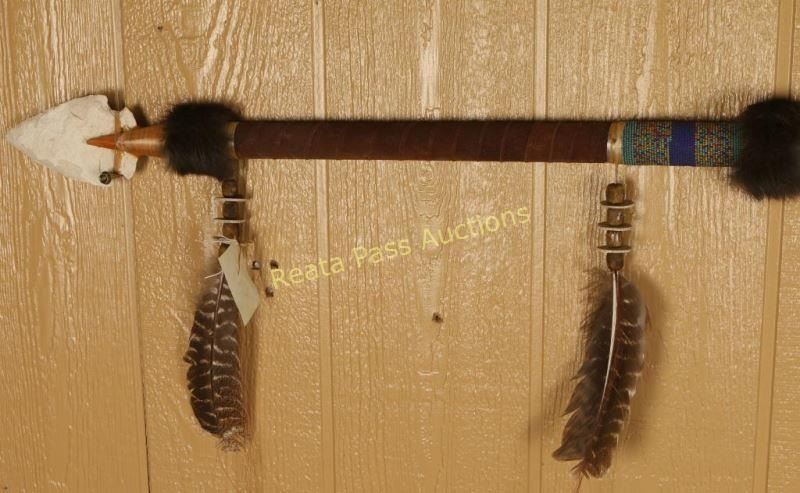 Wood construction wrapped in leather with beads, bone, feather and fur accents with stone a point. Measures 64 1/2" long. Great decorator.