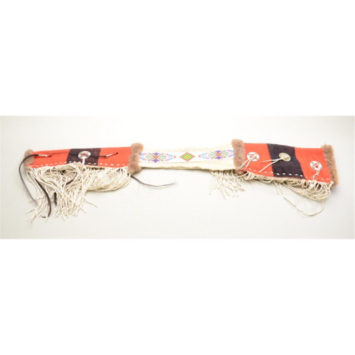 Contemporary Indian musket scabbard with leather fringe, beaded hide section and beaded trade blanket material section with metal cone and horsehair dangles, fur trim and abalone disc decorations; a very nicelooking display piece. Est.: $250-$500.