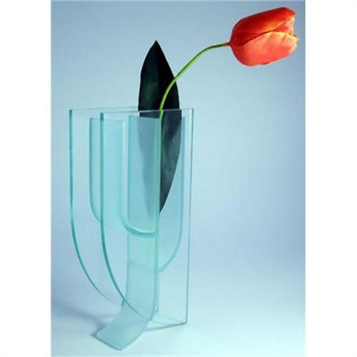 Ultra contemporary flower vase has two frosted wells measuring 5" and nearly 7" that "float" between two sheets of glass that arc on one side. Very unusual contemporary Italian design and superb craftmanship! Watertight.