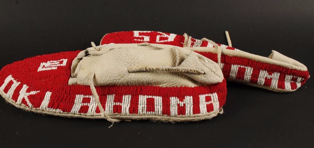 University Moccasins. Bright red with white lettering. Overall good condition.