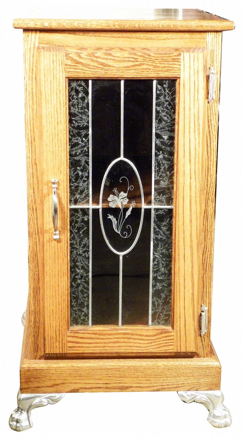 Contemporary Oak Slot Machine Stand with etched leaded glass doors. Nickel claw feet. Excellent condition. 19 X 34 X 20 inches.