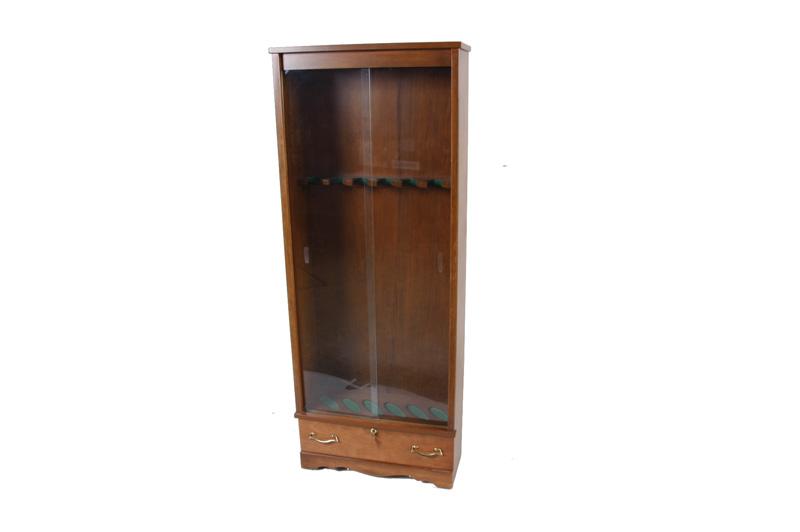 Contemporary Oak Veneer Rifle Cabinet 6 rifle capacity, sliding glass front, one locking drawer on bottom,measures 63"x24"x9 1/2".6 rifle capacity, sliding glass front, one locking drawer on bottom,measures 63"x24"x9 1/2".