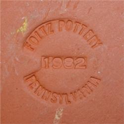 Contemporary PA cow decorated redware dish by Foltz Pottery and dated 1982. Measures 8" in dia. and is in excellent condition.