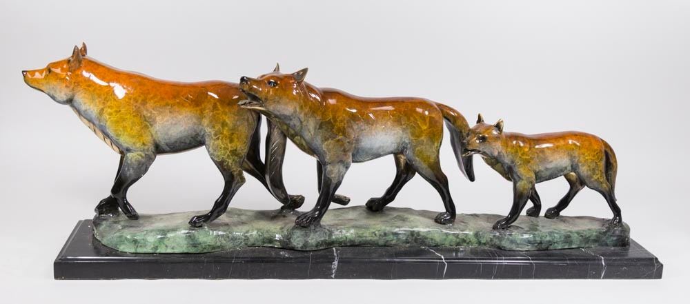 3 foxes on marble base. Approx. 11 1/4" H x 35 1/2" L without base. Approx. 13" H x 37" L x 7" D with base. (6083)