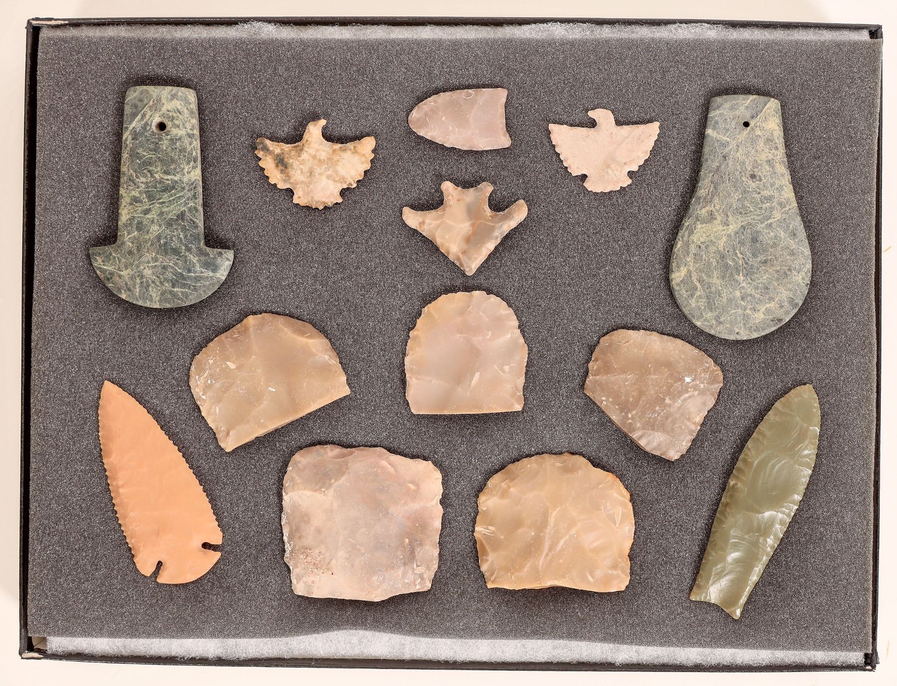 This collection of points include two pendants at 4.25 in., two effigy birds, five hoe or spades, one jadeite point at 4.75 in., one butterscotch corner notch at 4.0 in., a smaller side notch, and a lanceolate. A total of 13 points. All appear to be contemporary points; no information for origin of finds. All are spectacular, displayed in a large Riker box. Please see photos for details. [] [] [] [] []