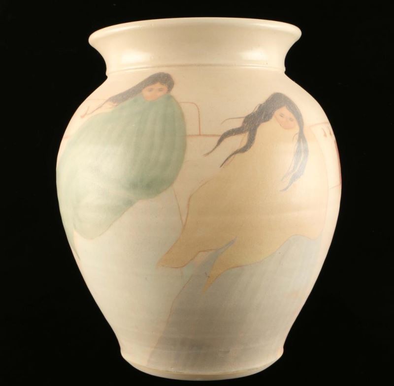 Large beige color pot with pueblos painted in the background and two blanketed women in the front. Signed 'Jen Lord 1977' on the bottom. Measures 14"h x 10"dia. Good condition