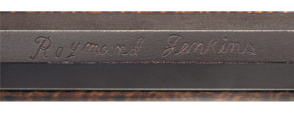 The top barrel flat is script marked "Raymond Jenkins" with "45 CAL" at the breech. The fixed sights are flanked with an engraving. Equipped with double set triggers. Plain lock plate and light engraving on the hammer. The nicely figured full length stock has an incised carving, silver forend cap, and a very ornate bird motif silver patch box on the right side of the buttstock with a cheekpiece on the left side featuring an eagle/shield engraved silver oval, silver trigger guard, crescent buttplate, side plate, and barrel escutcheons. The top of the wrist has an "A.W." marked initial oval. With a brass tipped maple ramrod. The ramrod pipes are also silver.