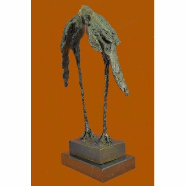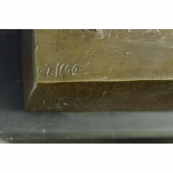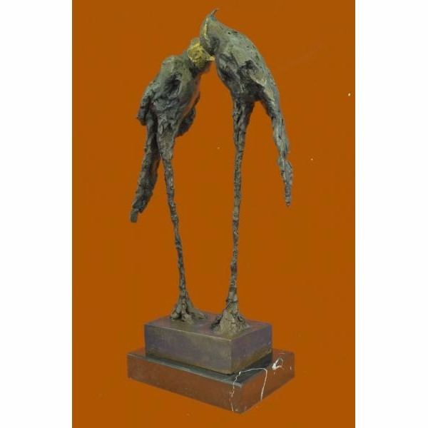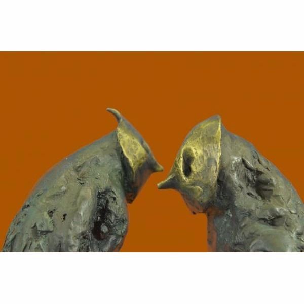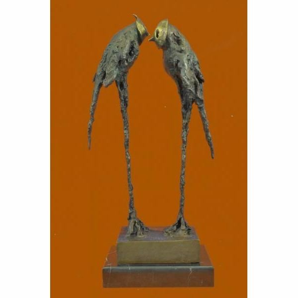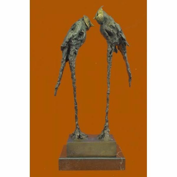 Very romantic stylish pair of bronze parrot sculptures standing tall on a simulated marshland. One parrot bird gazes forward towards its mate with its beak slightly raised while the other bird gazes to the side. Both sculptures have been treated with a lustrous bronze patina that has been applied by hand and polished. The parrot wings have abstract qualities and are finished with a Verde green patina which has a marble-like appearance with rippling grain patterns throughout the surfaces. The magnificent sculpture is mounted on a polished oval black marble base and is numbered. Condition : This sculpture is in perfect condition. Bronze Dimensions with Marble Base:Height 21" x Width 10" Marble Dimensions: 8" X 6" Height without base: 19" Weight :17 LBS Inventory : 43XNAL27810534