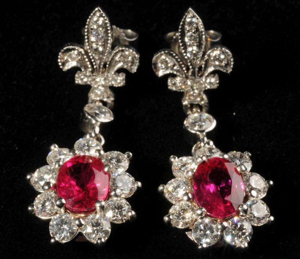 Custom made. The rubies are very fine with no eye visible inclusions and no cloudiness. They are well matched and very bright, full of fire and brilliance, and are a deep, even blood red color. These two rubies weigh 2.31 carats total weight for both. The diamonds are surrounded by nine round brilliant cut diamonds that have an approximate GIA color and clarity grade of "G-H/VS1-VS2". These stones are well cut and matched. There are 2.2 carats total weight in diamonds. The earrings are accompanied by appraisal #63775 done by Accredited Gem Appraisers at 730 Sansom St. in Philadelphia, PA. Appraised for $8,000. Jewelry