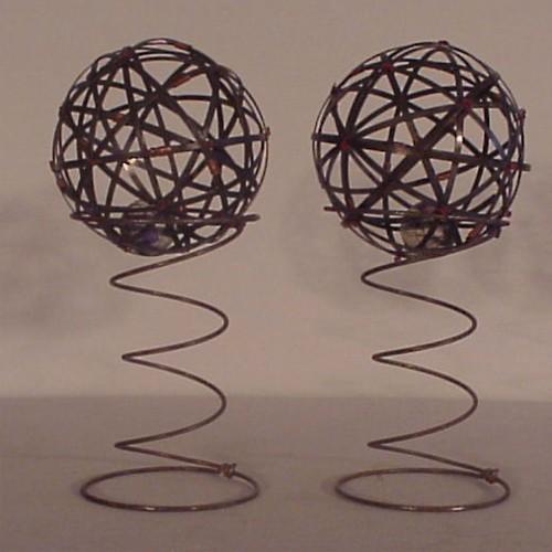Contemporary School (two) UNTITLED, a pair of fabricated steel and copper orbs with collaged balls inside, each balanced on formed metal stands, measuring 8" tall with stands. (2)