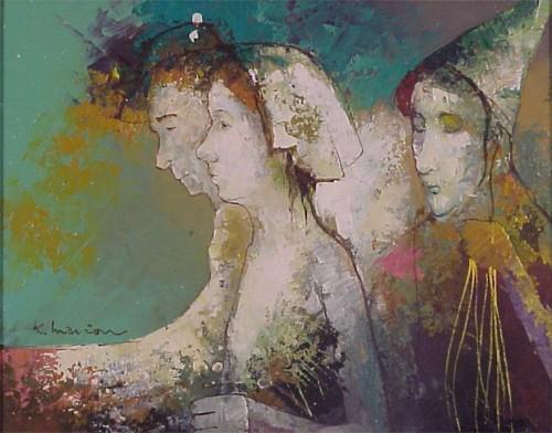 Contemporary School THREE FIGURES, oil painting on board, 8 x 10", signed lower left “K?. Marion", framed.