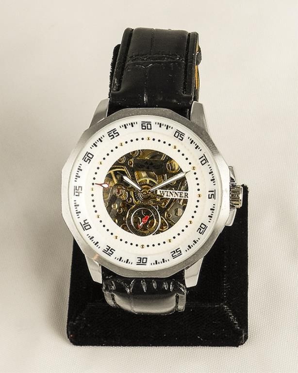 Men's Contemporary Skeleton Stainless Steel Watch. White Skeleton Face With White Dial Hands. Watch Has A Black Leather Band Accented With Stainless Steel Case.