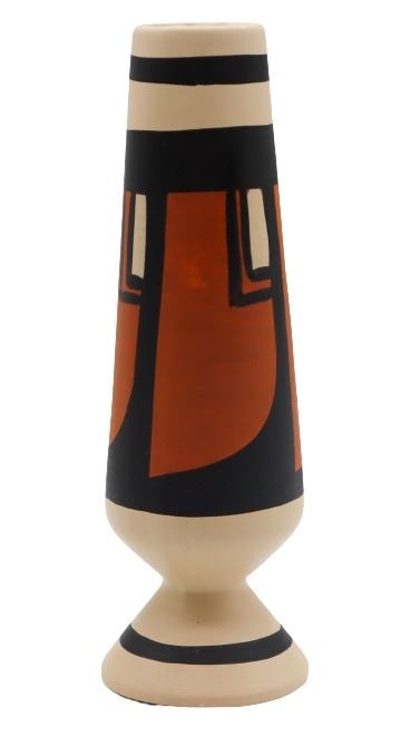 Native American vase, with abstracted feather polychrome design, signed on bottom.