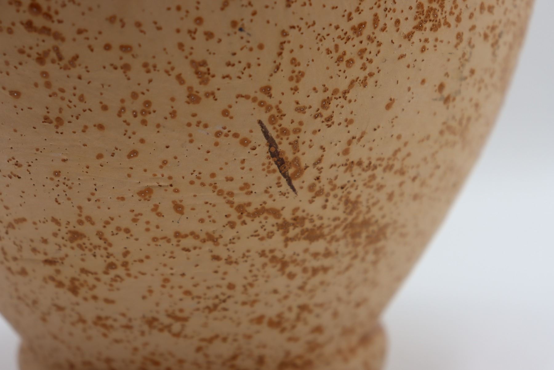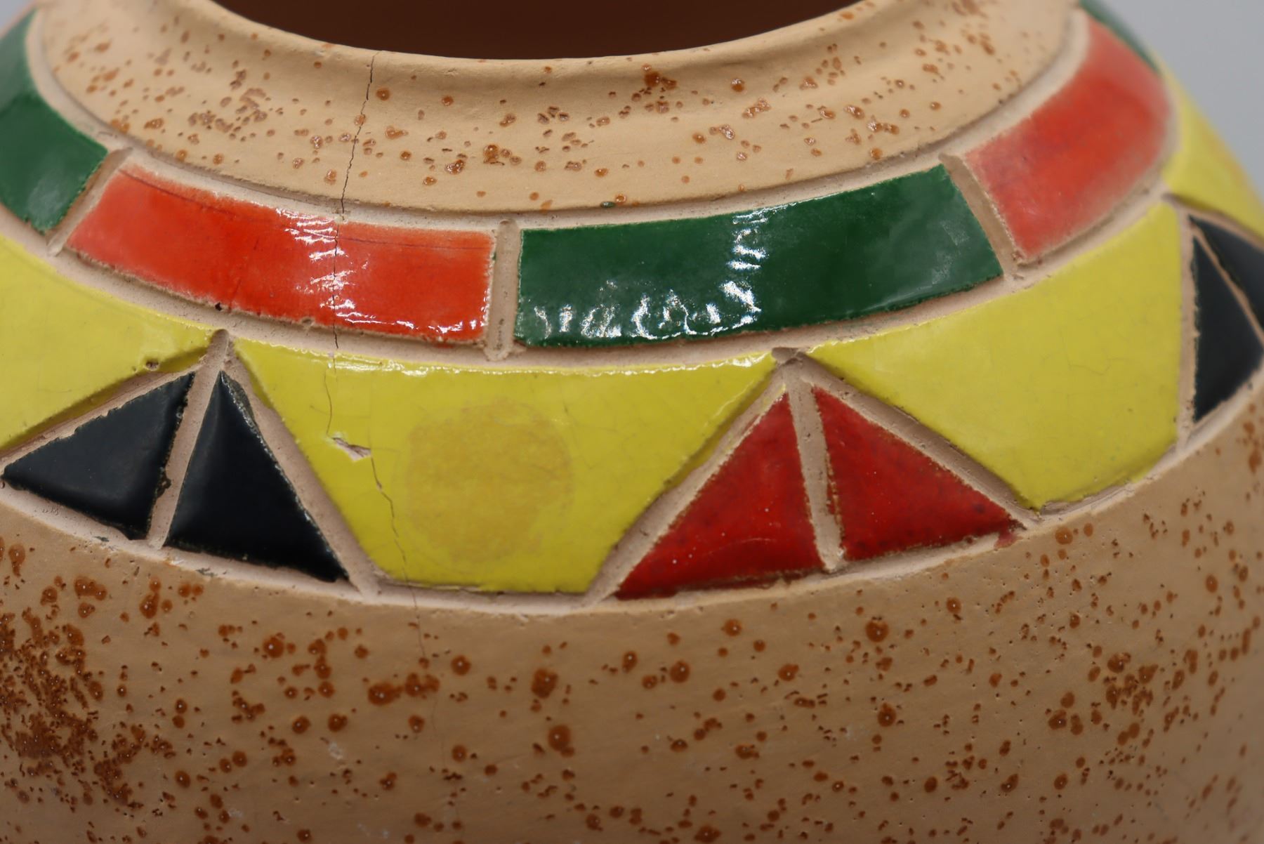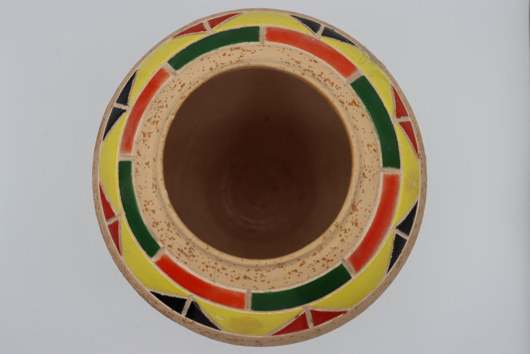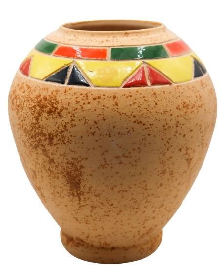 Contemporary Native American sand finish vase with orange, red, green, black glazed ceramic trim.
