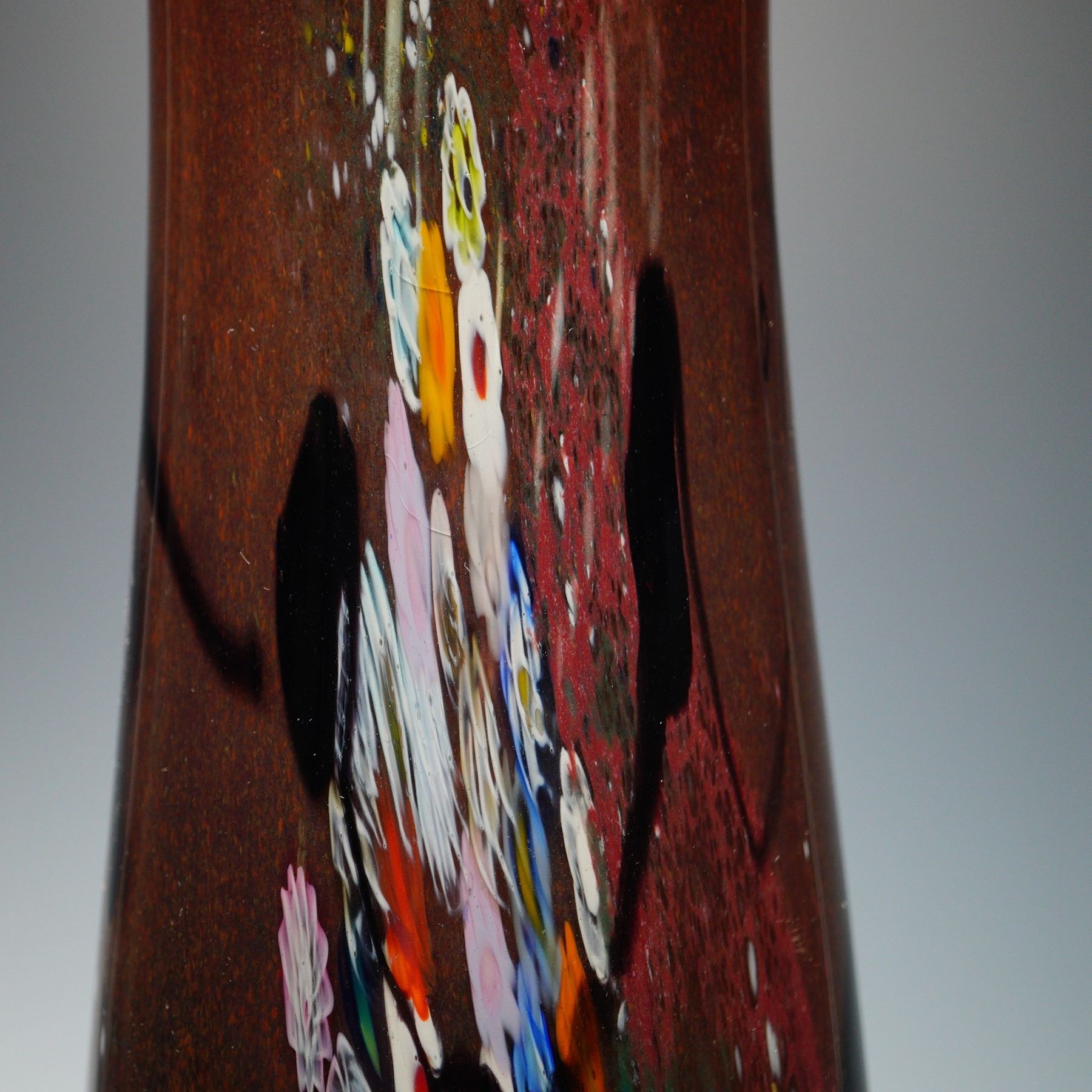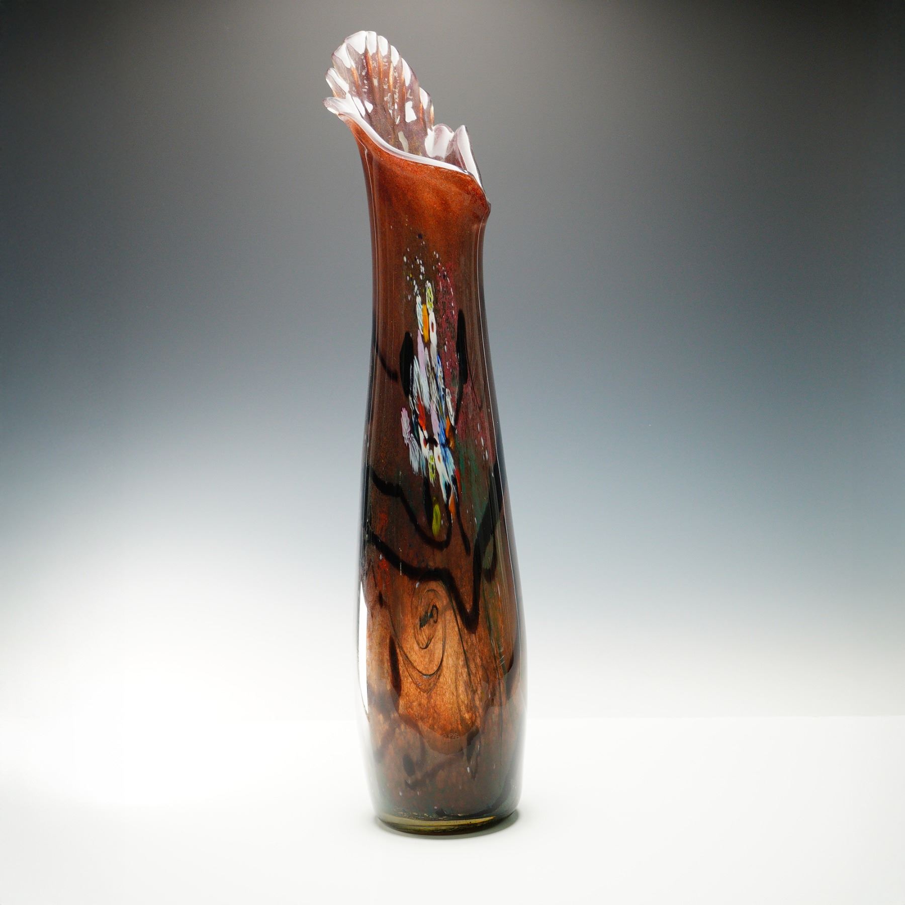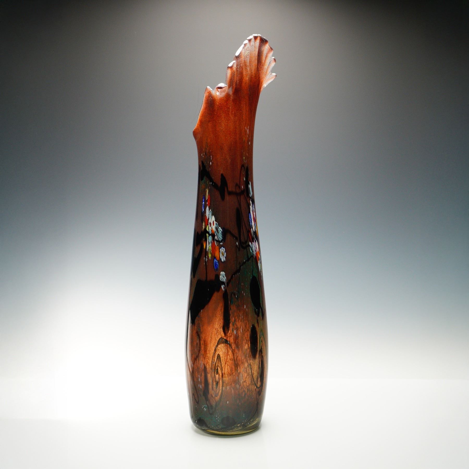 Striking contemporary studio art glass vase signed Colla, executed in richly iridescent bronze and copper tones with swirling ribbons of black and green and embedded millefiori-style inclusions in vivid colors. The elongated hand-blown form rises with fluid grace to a dramatic asymmetrical flared rim, delicately ruffled and edged in pale lavender. The surface shimmers with layered depth and scattered micro-bubbles, creating a dynamic interplay of texture and light. Engraved signature near the base. Likely late 20th century, in the Murano style.