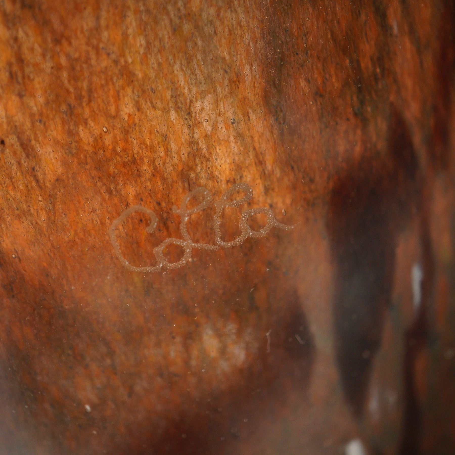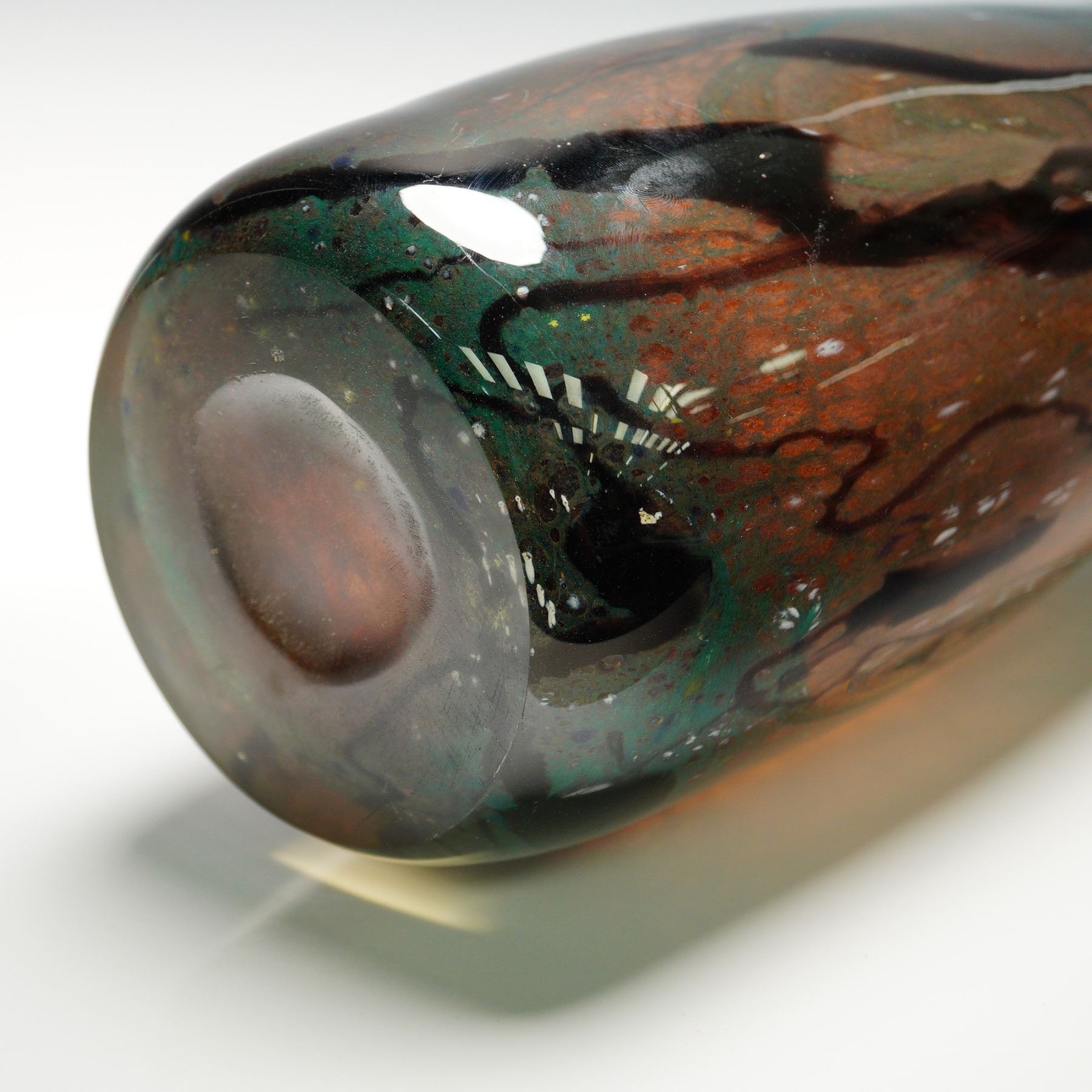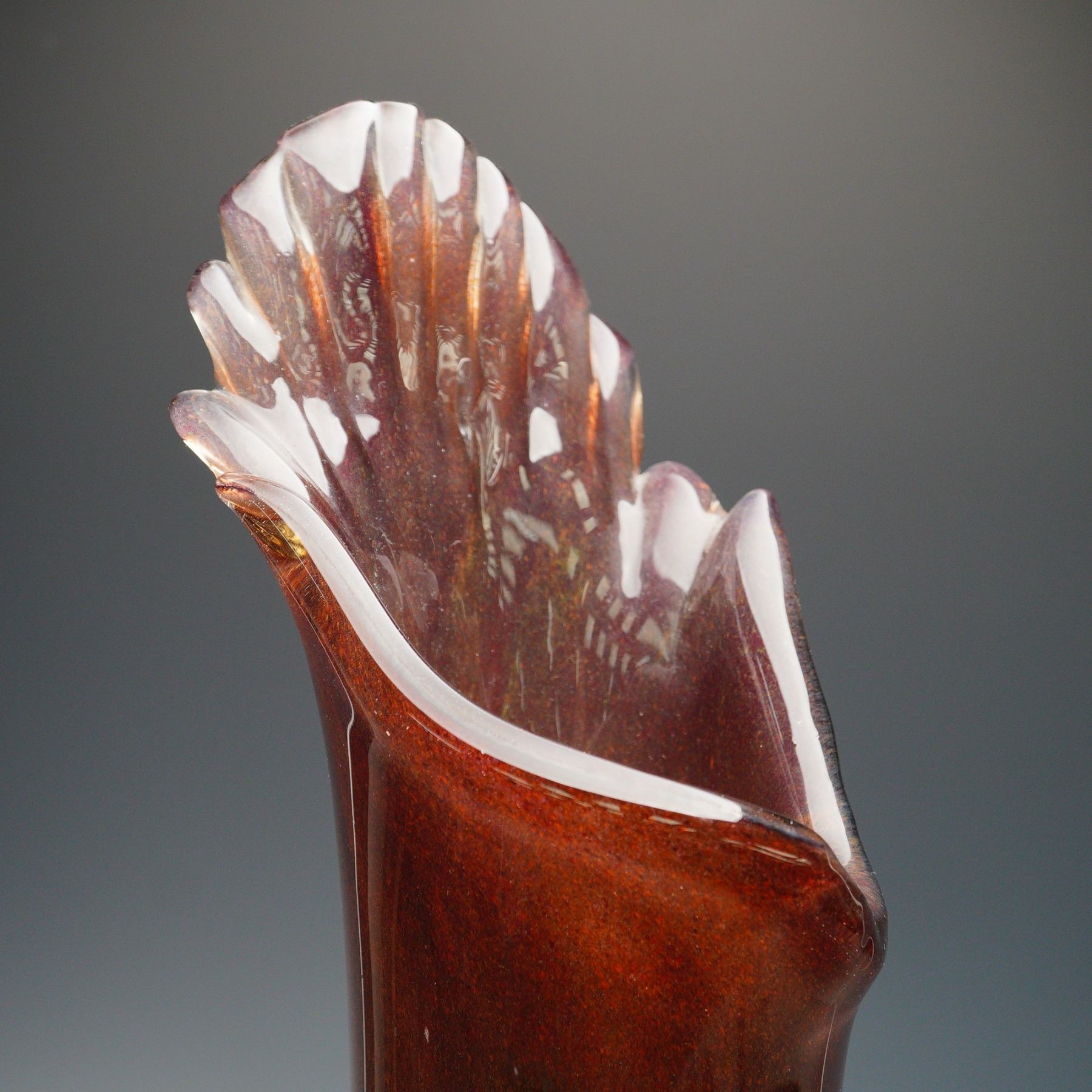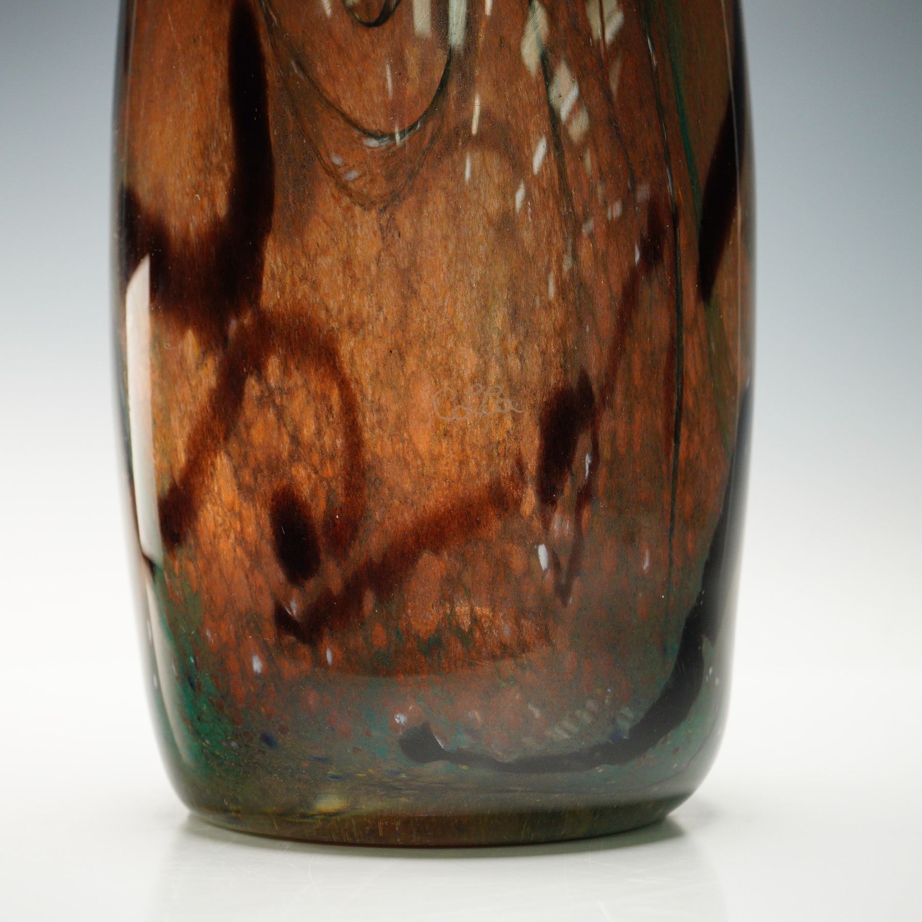 Striking contemporary studio art glass vase signed Colla, executed in richly iridescent bronze and copper tones with swirling ribbons of black and green and embedded millefiori-style inclusions in vivid colors. The elongated hand-blown form rises with fluid grace to a dramatic asymmetrical flared rim, delicately ruffled and edged in pale lavender. The surface shimmers with layered depth and scattered micro-bubbles, creating a dynamic interplay of texture and light. Engraved signature near the base. Likely late 20th century, in the Murano style.