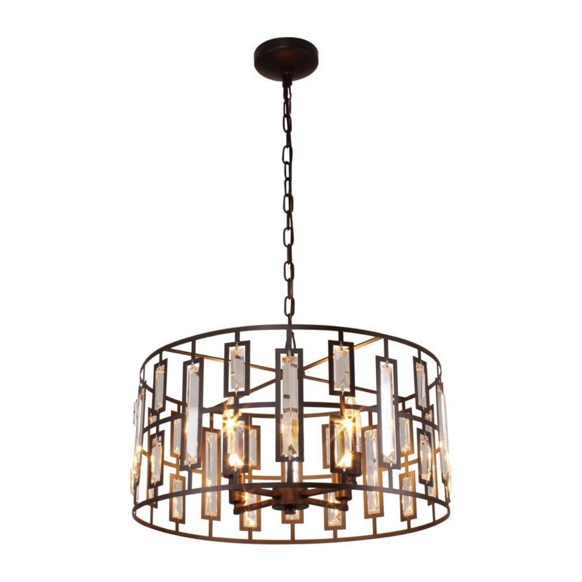 Contemporary-style 4-light ceiling pendant light with drum shaped shade with crystal glass prisms & an oil rubbed bronze finish over metal frame. 20" W X 10 1/2" H.Â