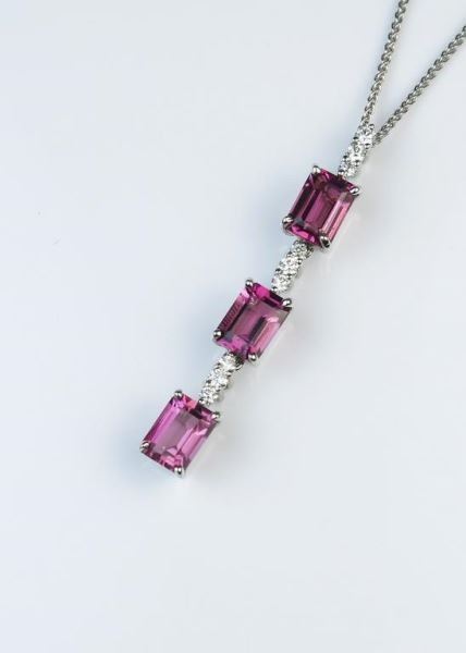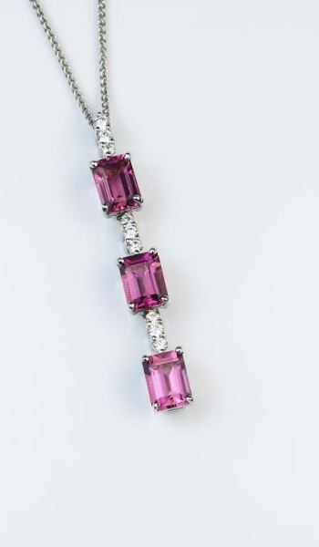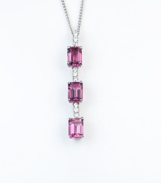 Pendant. Features 3 emerald cut Tourmalines weighing approx. 4.00 carats total accented with nine 'IDEAL' cut Diamonds weighing approx. 0.30 carats with F-G colors and VS clarity crafted in a 14K white gold setting.