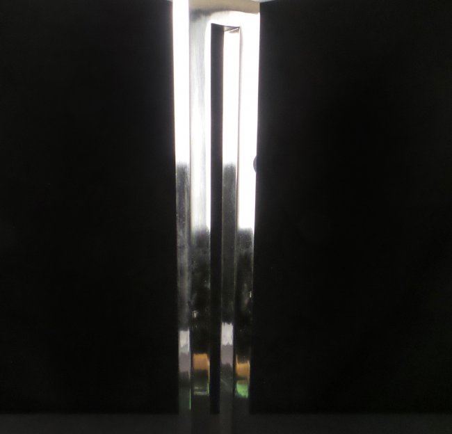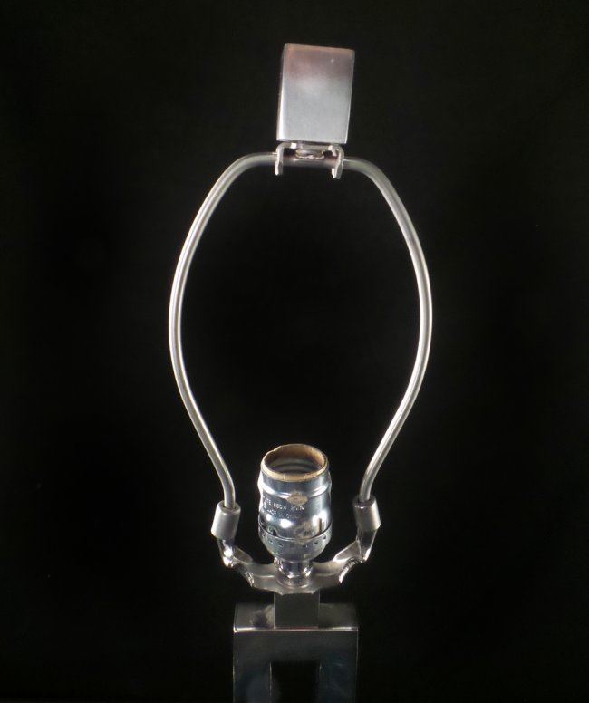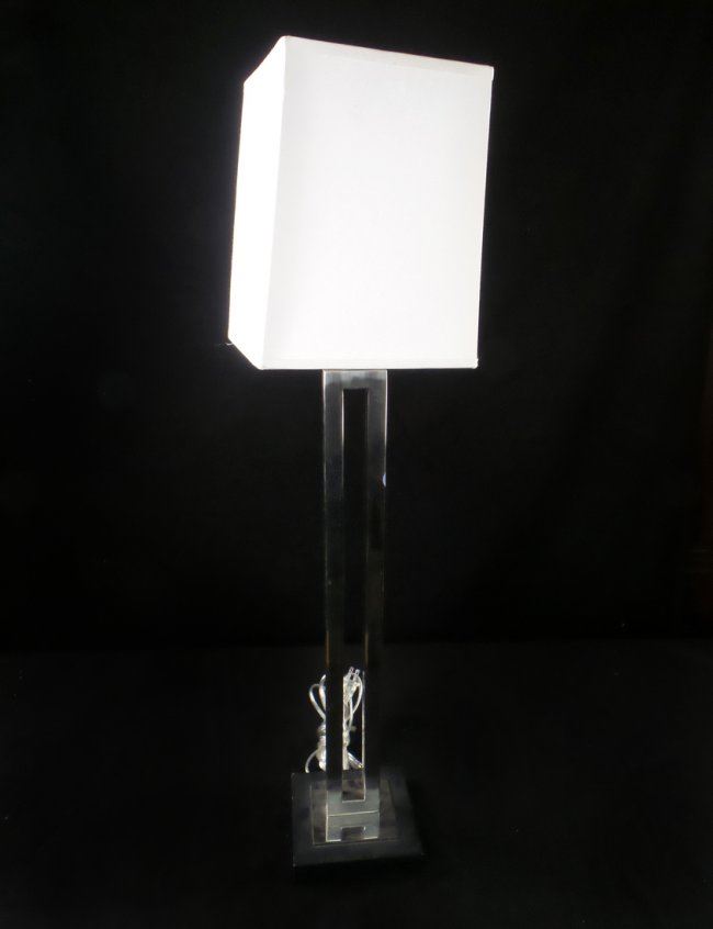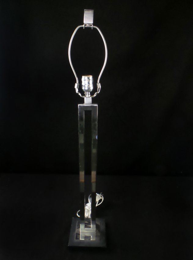 Polished nickel square stock post, on painted wood base, with matching nickel finial. [31 1/2" H]. In good condition. Mate to Lot 319.