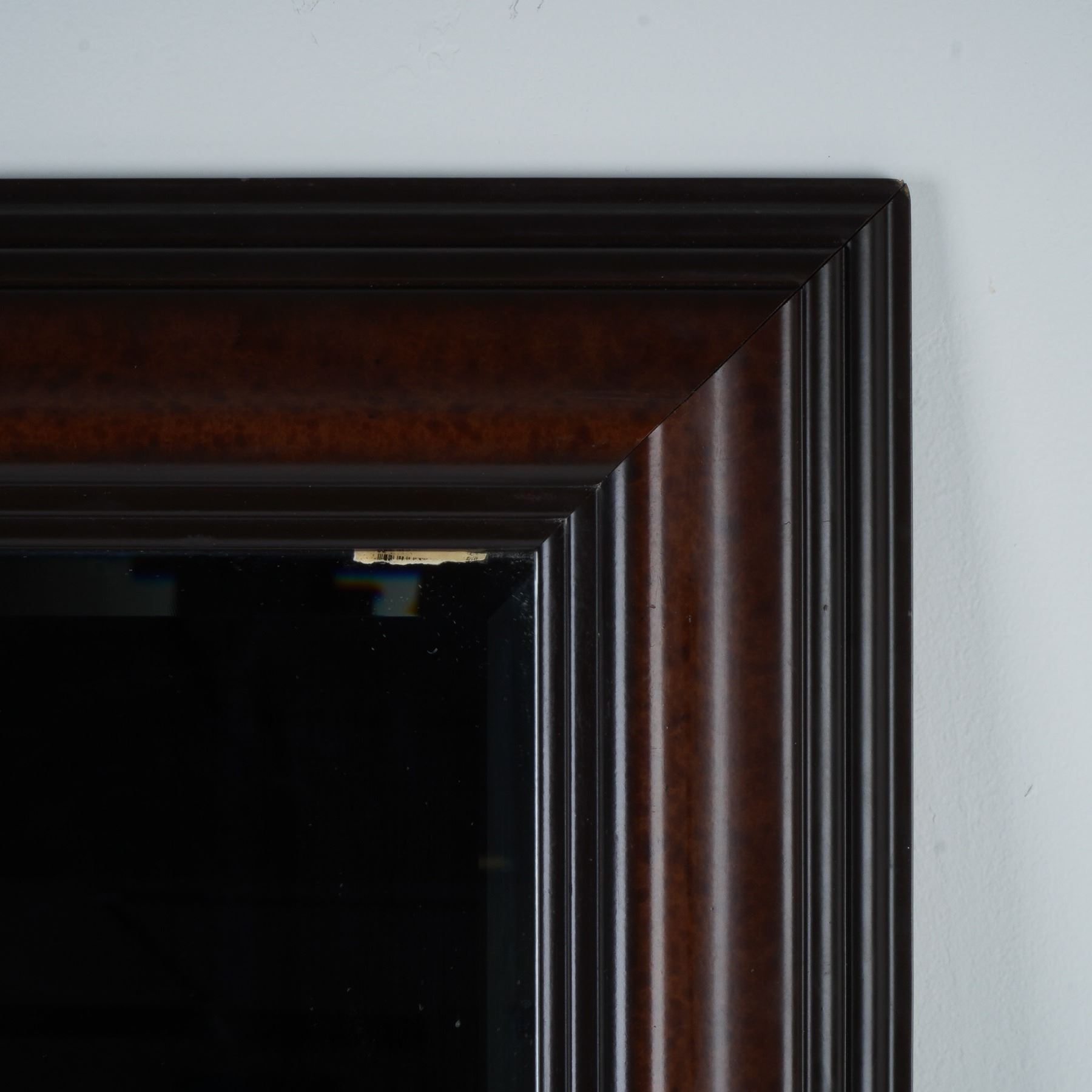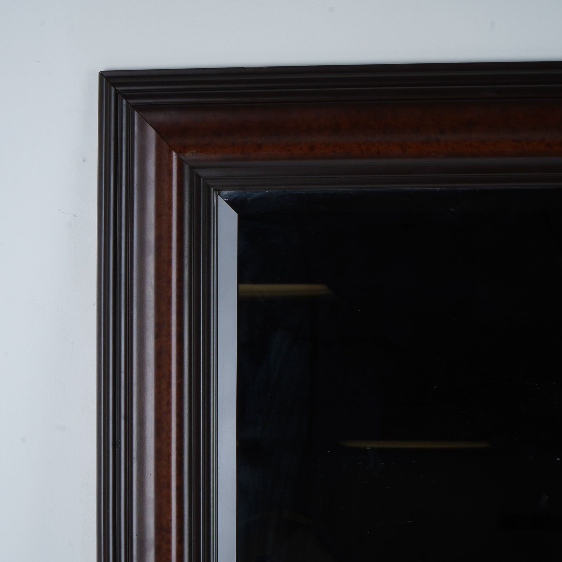 Contemporary rectangular wall mirror featuring a sleek, beveled edge and a wide frame with a dual-tone finish in rich brown and black. The molding is gently ribbed with a subtle woodgrain texture, creating a modern yet classic look suitable for various interior styles. Mirror includes rear hanging hardware and an inspection sticker.