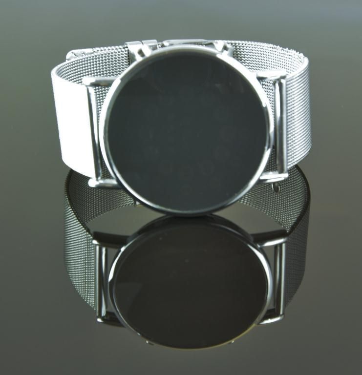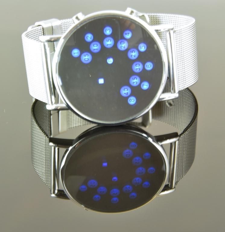 Contemporary Stainless Steel Watch With Mesh Band And Led Display. Quartz Movement With Watch And Complete Calendar Display And Water Resistant. Display Is Illuminated In Blue.