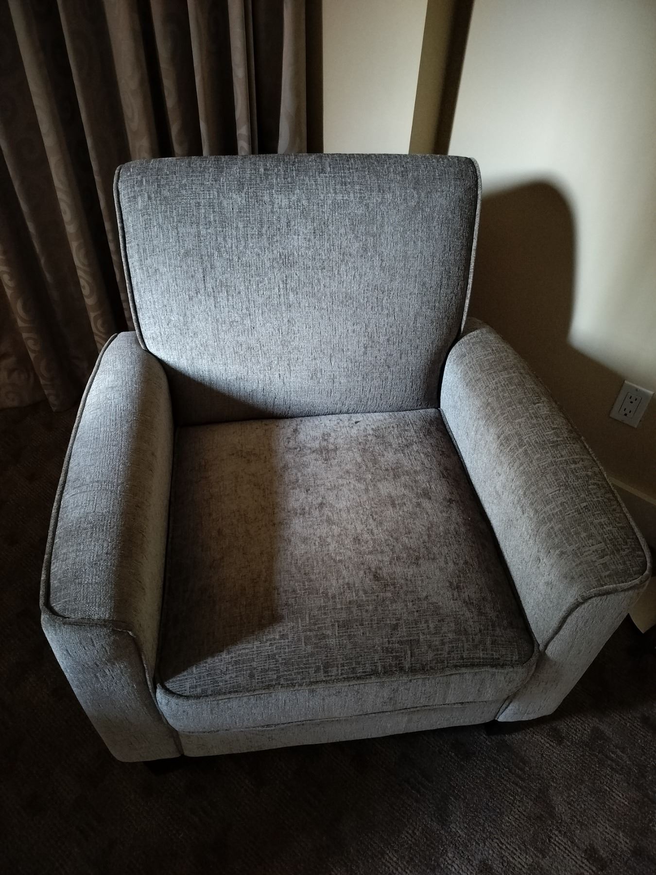 Grey Upholstered Chair - 35" tall x 33" wide x 31" deep