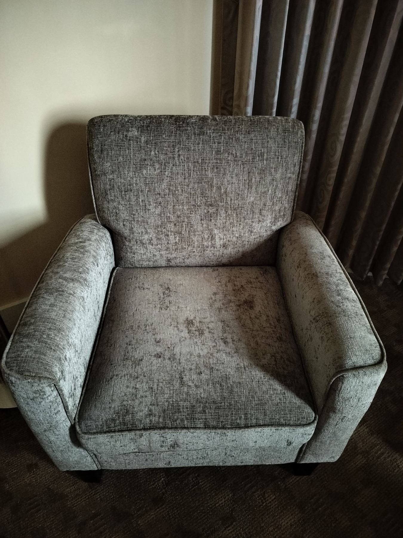 Grey Upholstered Chair - 35" tall x 33" wide x 31" deep