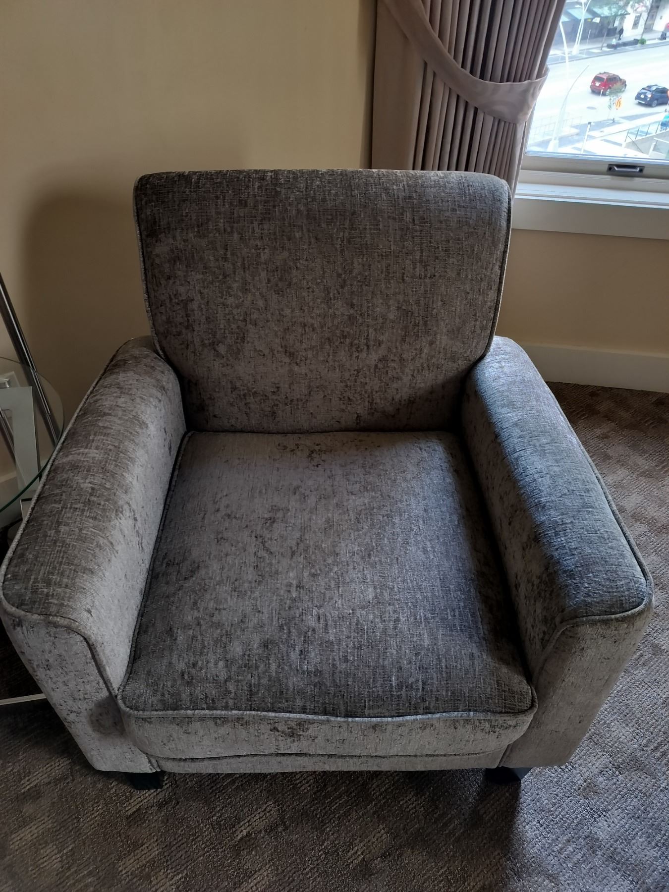 Grey Upholstered Chair - 35" tall x 33" wide x 31" deep