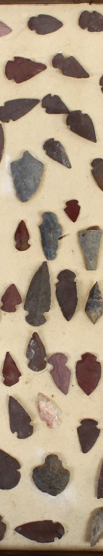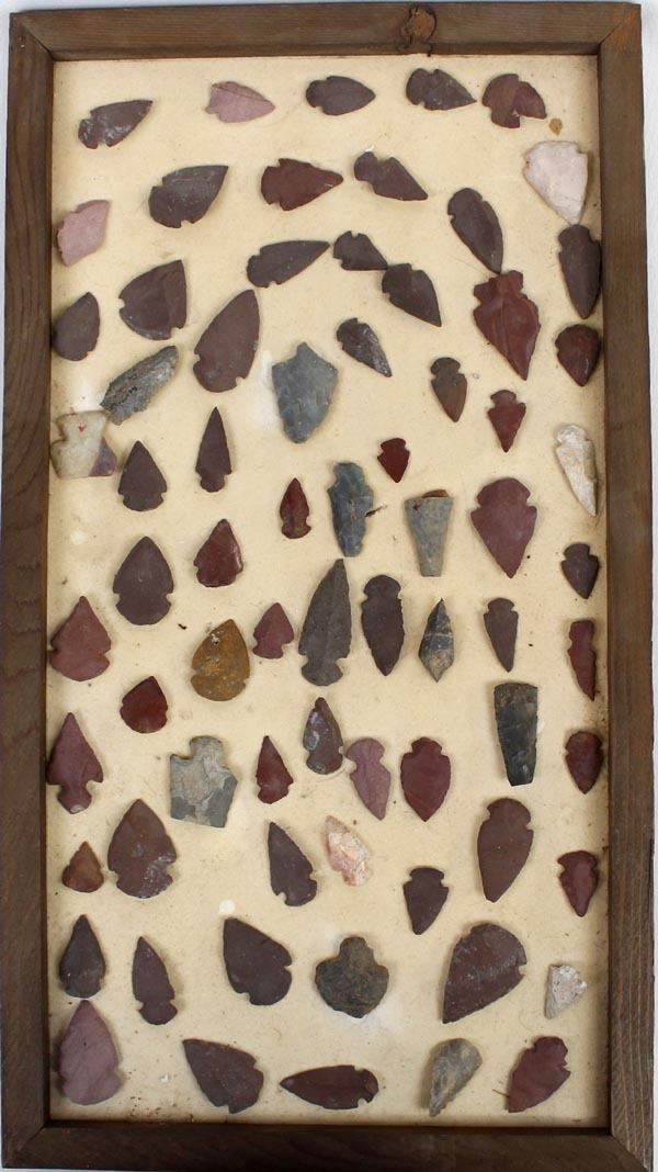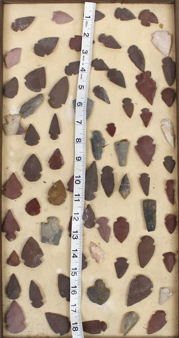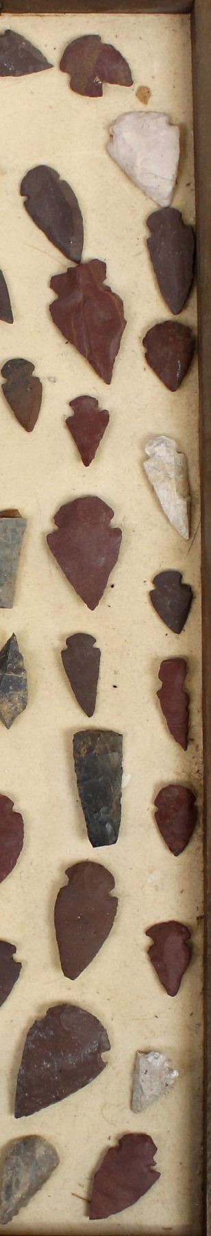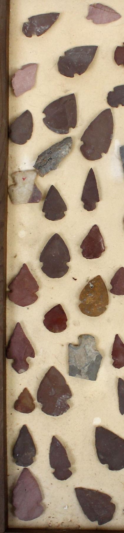 Contemporary and Prehistoric Native American Stone Arrowheads Display, largest measures 2'' x 1''
