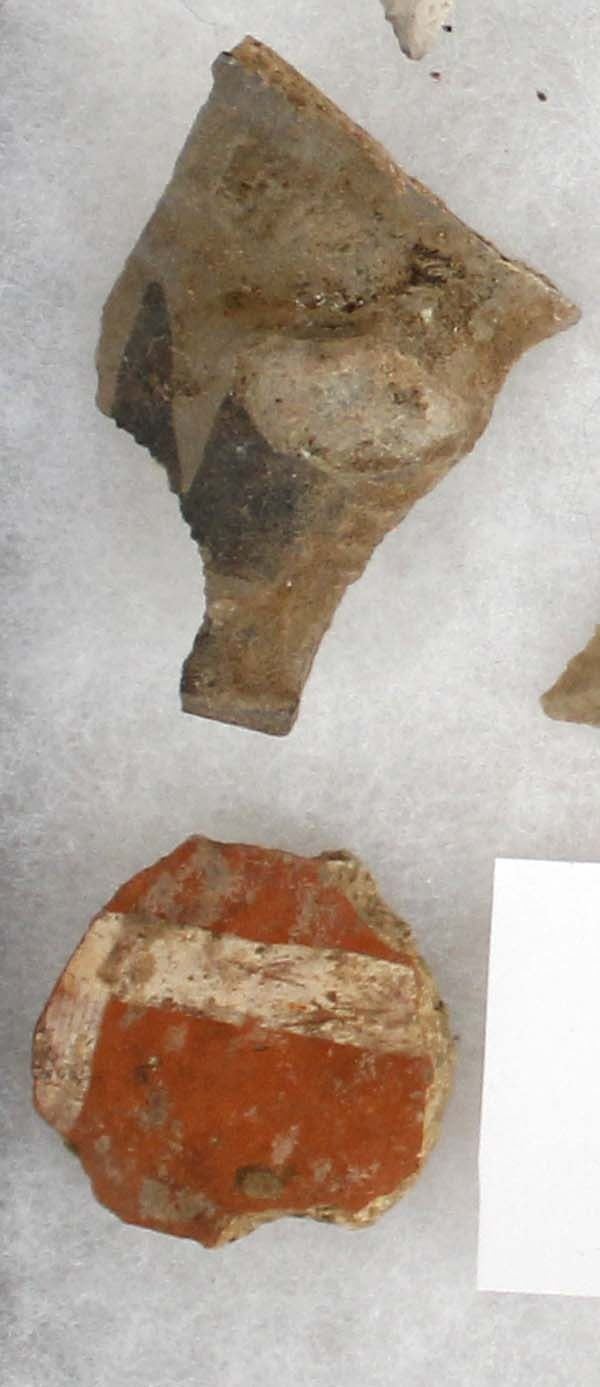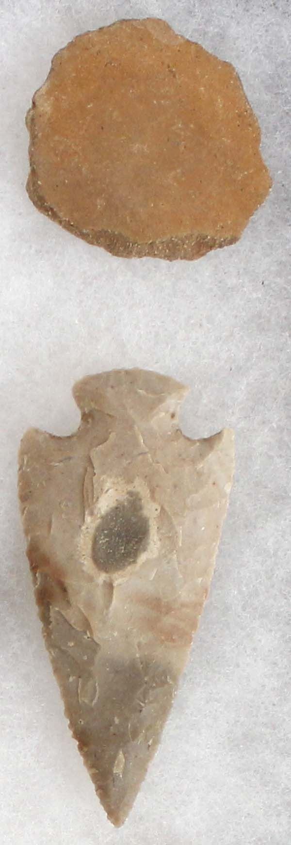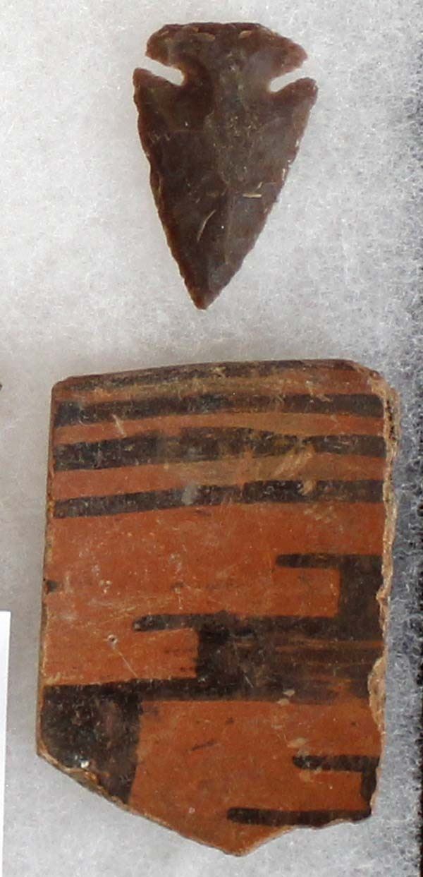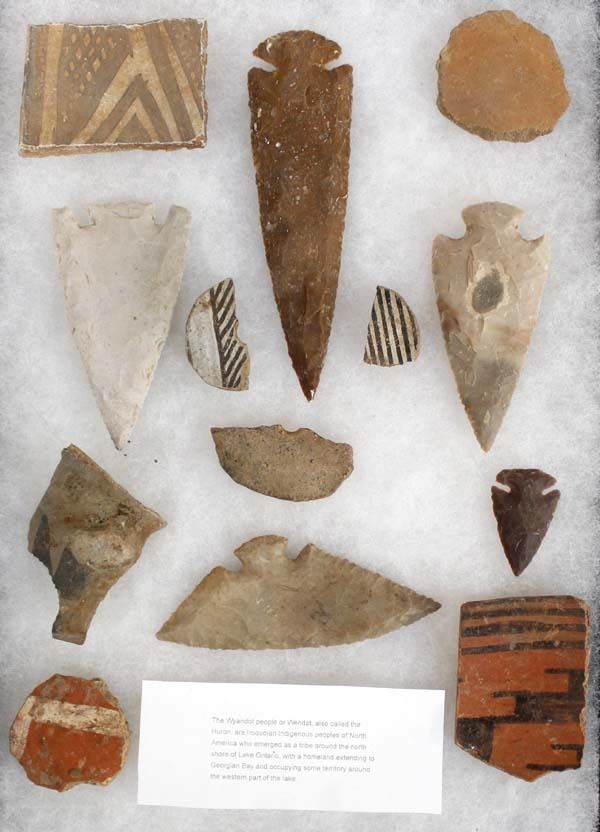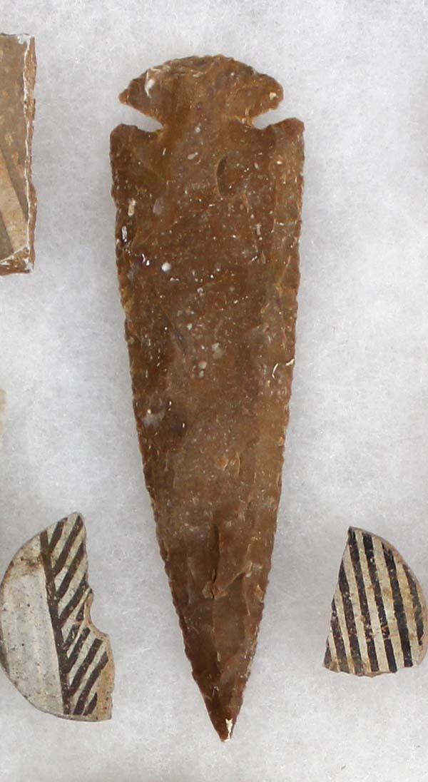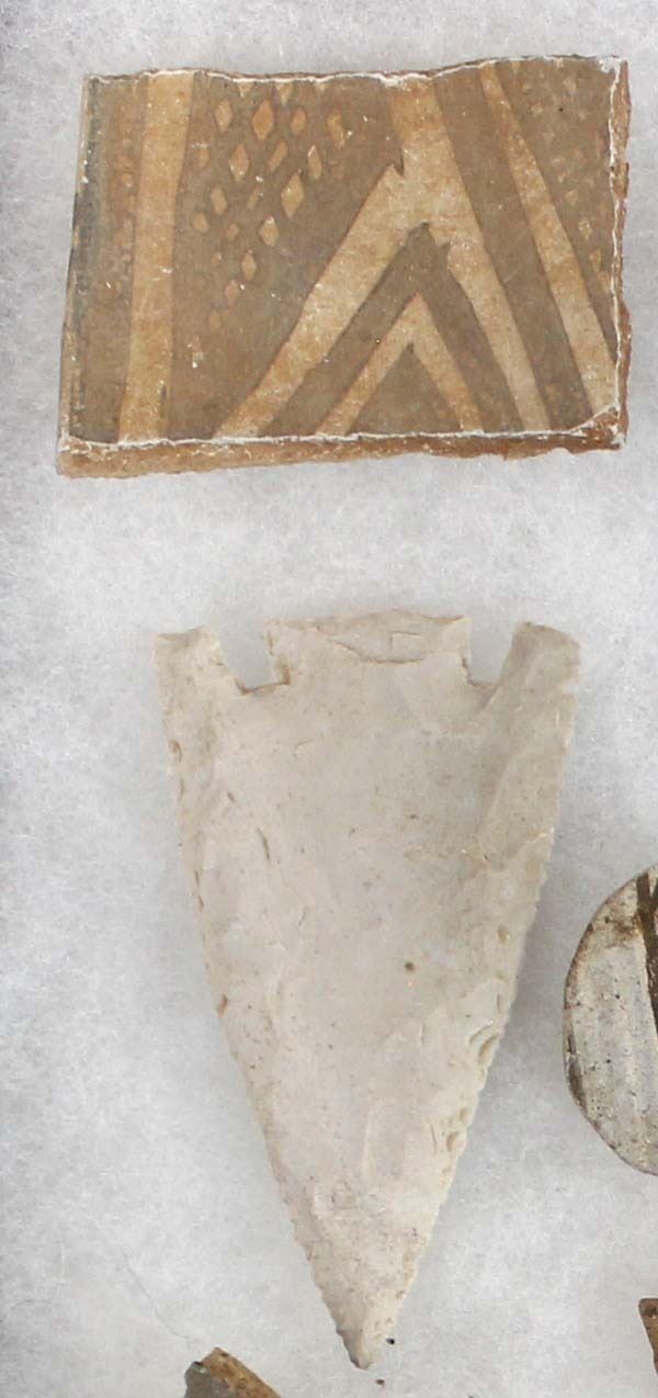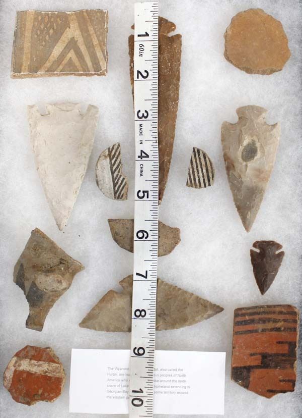 Contemporary and Prehistoric Native American Collectibles, includes 1. Contemporary Hand Knapped Wyandot Huron Spearpoint, measures 5''L x 1.5''W 2. Contemporary Hand Knapped Wyandot Huron Spearpoint, measures 3.25'' x 1.5'' 3. Contemporary Hand Knapped Wyandot Huron Corner Tang Knife, measures 3.75'' x 1.5'' 4. Prehistoric Pottery Handle Sherd 5. Prehistoric Pottery Pendant Remnant 6. Two Worked Prehistoric Pottery Rounds 7. Prehistoric Black on White Partial Pottery Pendant 8. Prehistoric Black on White Partial Pottery Pendant 9. Prehistoric Black on Red Pottery Bowl Rim Sherd 10. Prehistoric Black on White Pottery Bowl Rim Sherd 11. Contemporary Hand Knapped Wyandot Huron Stone Spearpoint, measures 3.25'' x 2''