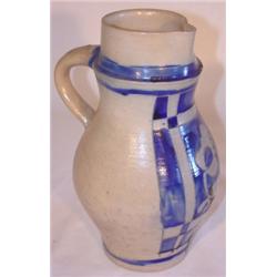 Contemporary blue decorated stoneware handled pitcher. Measures 11" tall and has floral design on body.