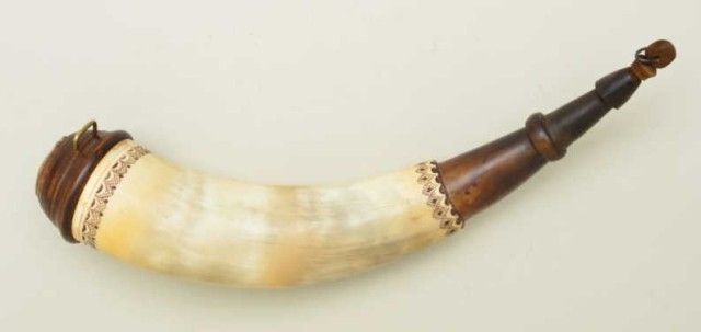 Contemporary carved powder horn in American 18th century style showing a carved horn compartment in plug which hinges up to reveal compass and is decorated with the figure of a winged griffin and shows a commemorativedate of 1758. The top and bottom of horn show a band of decoration. The horn is signed "Cravener". The horn measures 13" across the curve and approx. 2-1/2" across plug in butt. Made last 50 years.Est.;$250-$500.