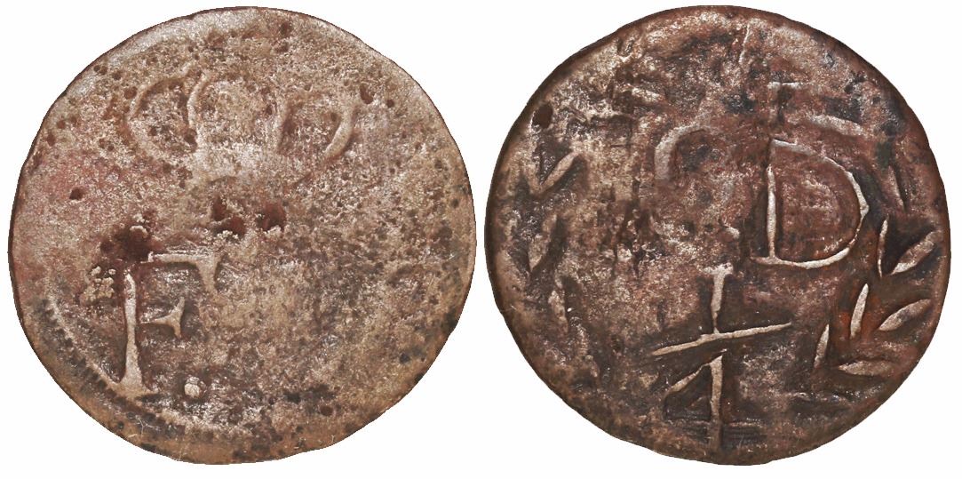 Contemporary counterfeit of a Santo Domingo, Dominican Republic, copper 1/4 real (cuarto), Ferdinand VII, struck ca. 1810-20. 2.72 grams. Crudely cast VG with full SD side but F7 side very weak, interesting as clearly circulated but not officially struck.