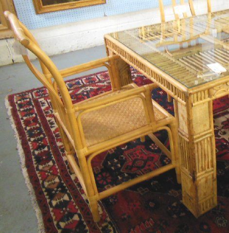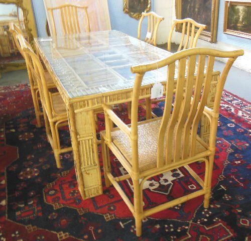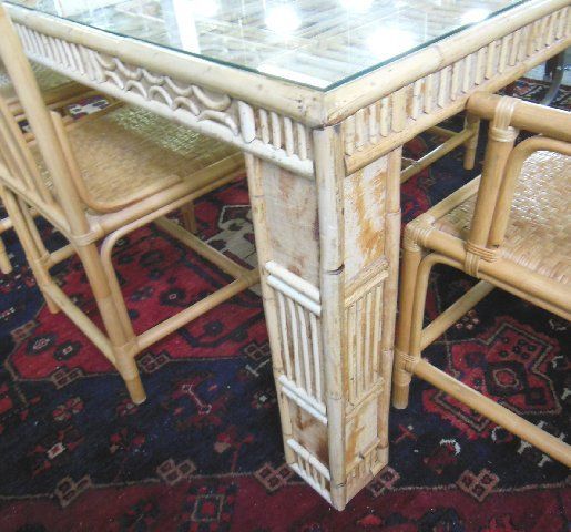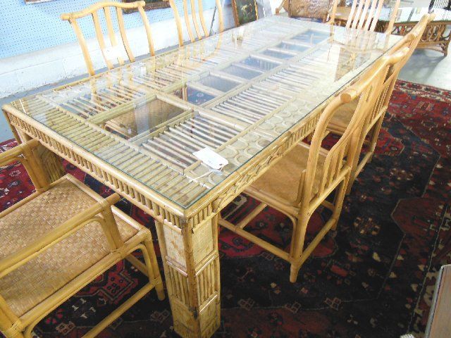 Bamboo & linen backing, glass top, perfect condition, 2 arm chairs, 4 side chairs. Table approx. 29.5" H x 42" W x 7" D.