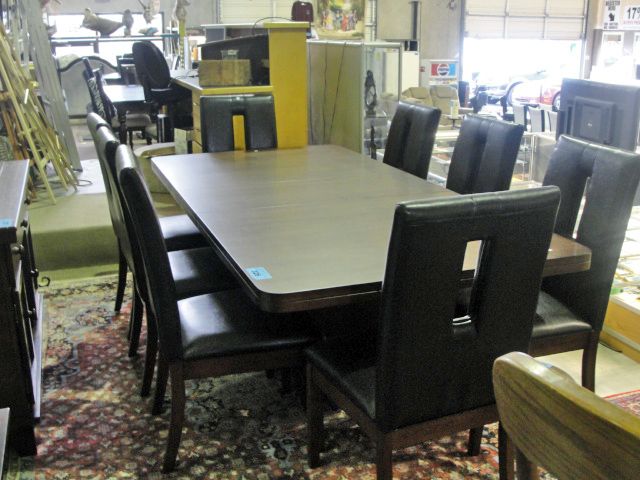 storage single pedastol base and 8 brown leather upholstered side chairs