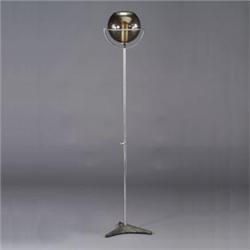 Contemporary floor lamp with bright chrome shaft, hemispheric smoke glass shade with flaring canister fixture, on a weighted triangular base. Unmarked. 63" x 12" $200 - 400