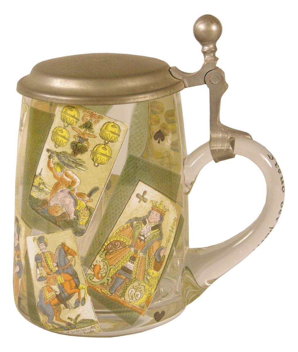 Contemporary glass Stein with card motif overlay, ca. 1990. No chips or cracks, excellent condition. Measures 6 1/2 inches tall.