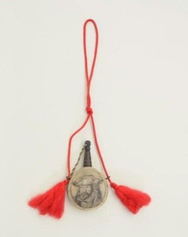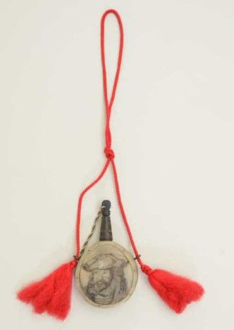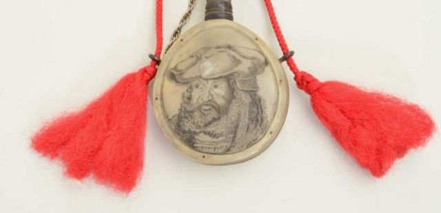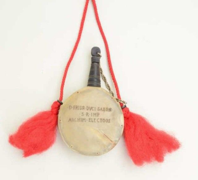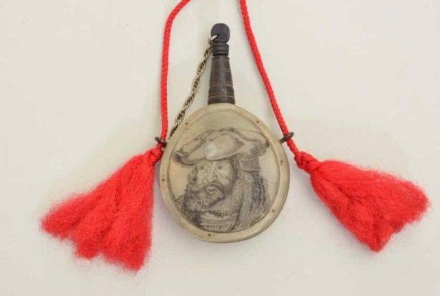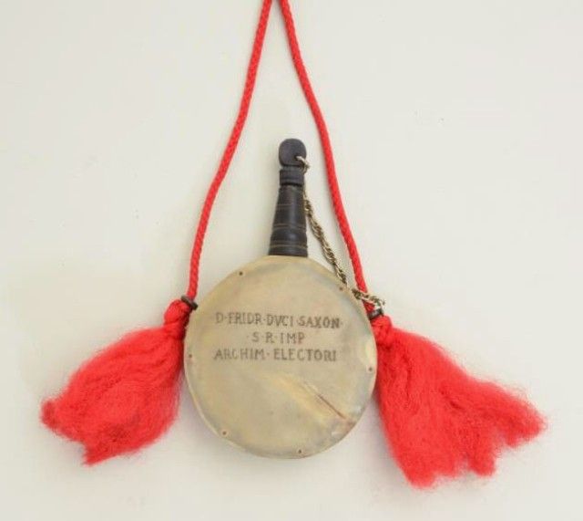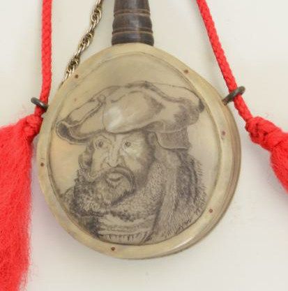 Contemporary made in last fifty years wheel lock style powder horn showing carved and inked portrait of Saxon Elector with his title carved on reverse. The condition is fine to excellent, the flask nicely detailedand well made with wood turned spout and plug. The horn is made in three sections and is signed "Cravener". Est.;$350-$700.