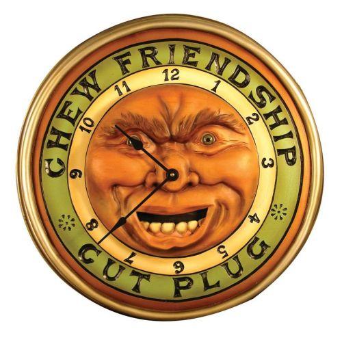 Contempory hand carved wood Clock for Friendship Cut Plug Tobacco.Carved by artist, Jim Smock of Santa Barbara, CA. Jim is one of the most renown carvers of our time. He is noted for his exquisite detail and realistic portrayal. Mint condition. 20 inch diameter.