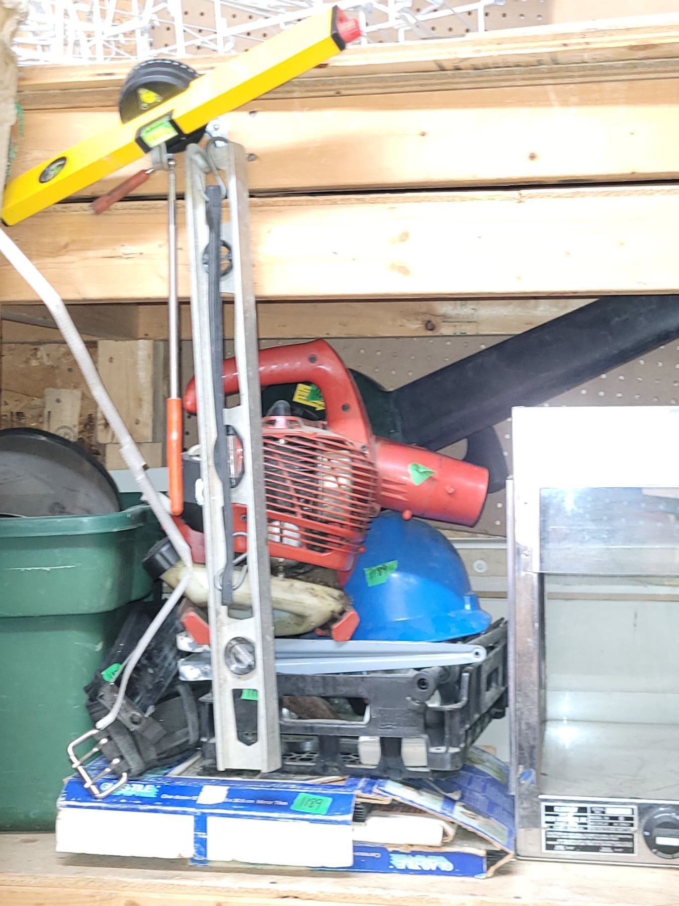 Contents Hanging From Wooden Shelf | Saw | Rubber Straps | Levels