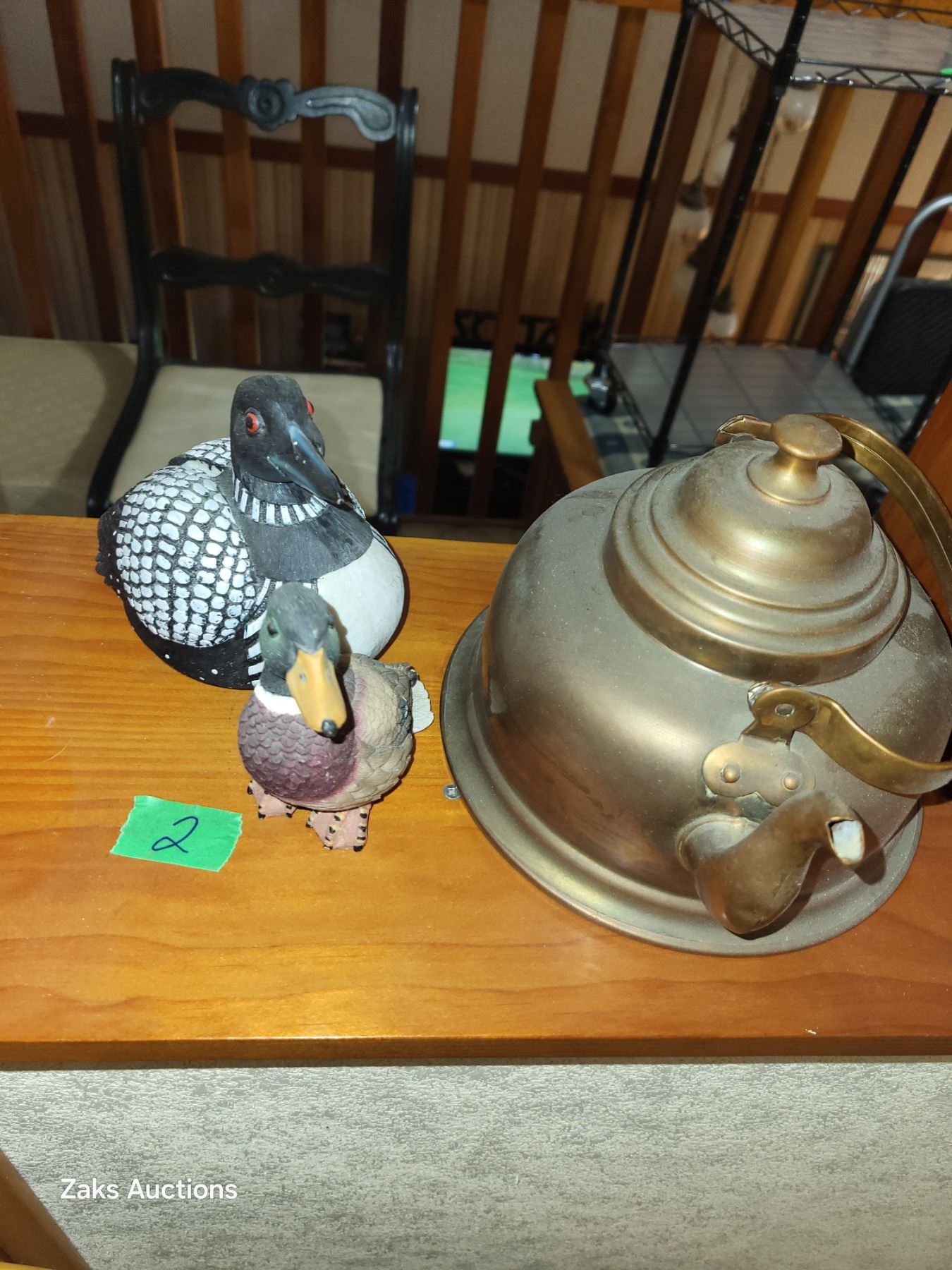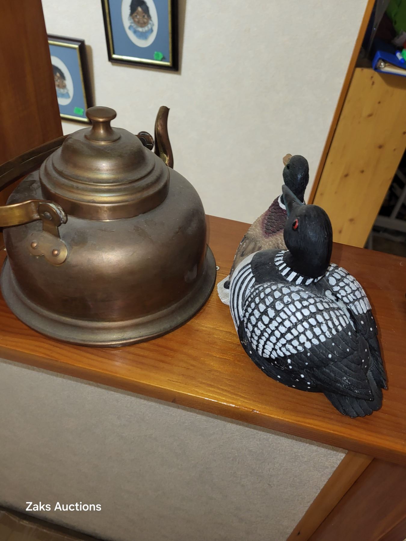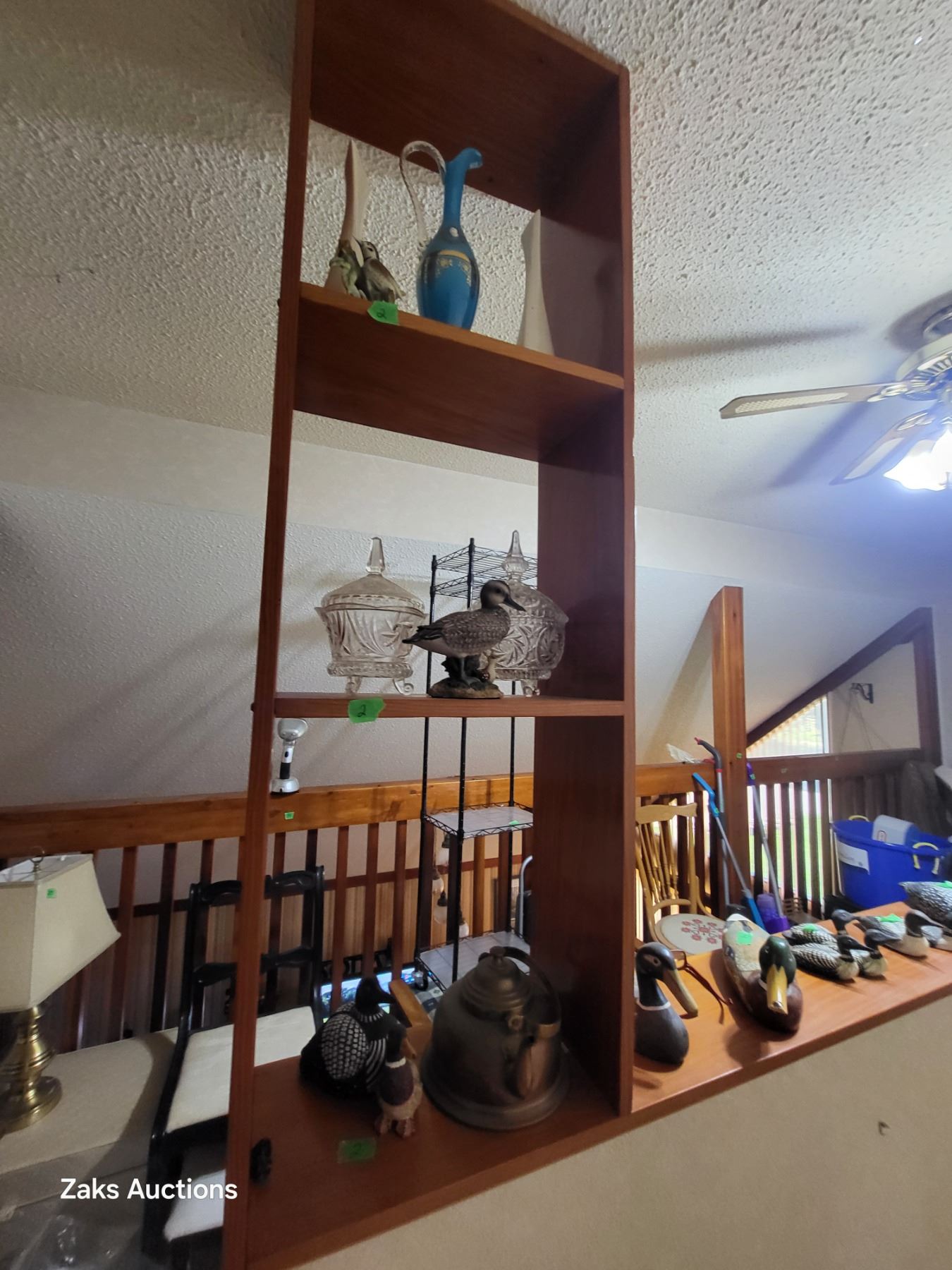 Contents of 3 Shelves - Copper Kettle, Ducks, Crystal + Mid Century Vases + Flicker Japan Bird