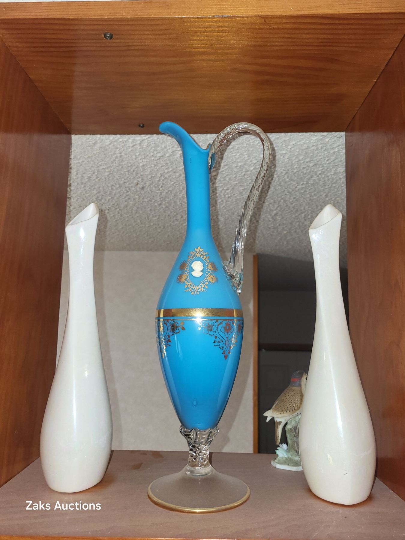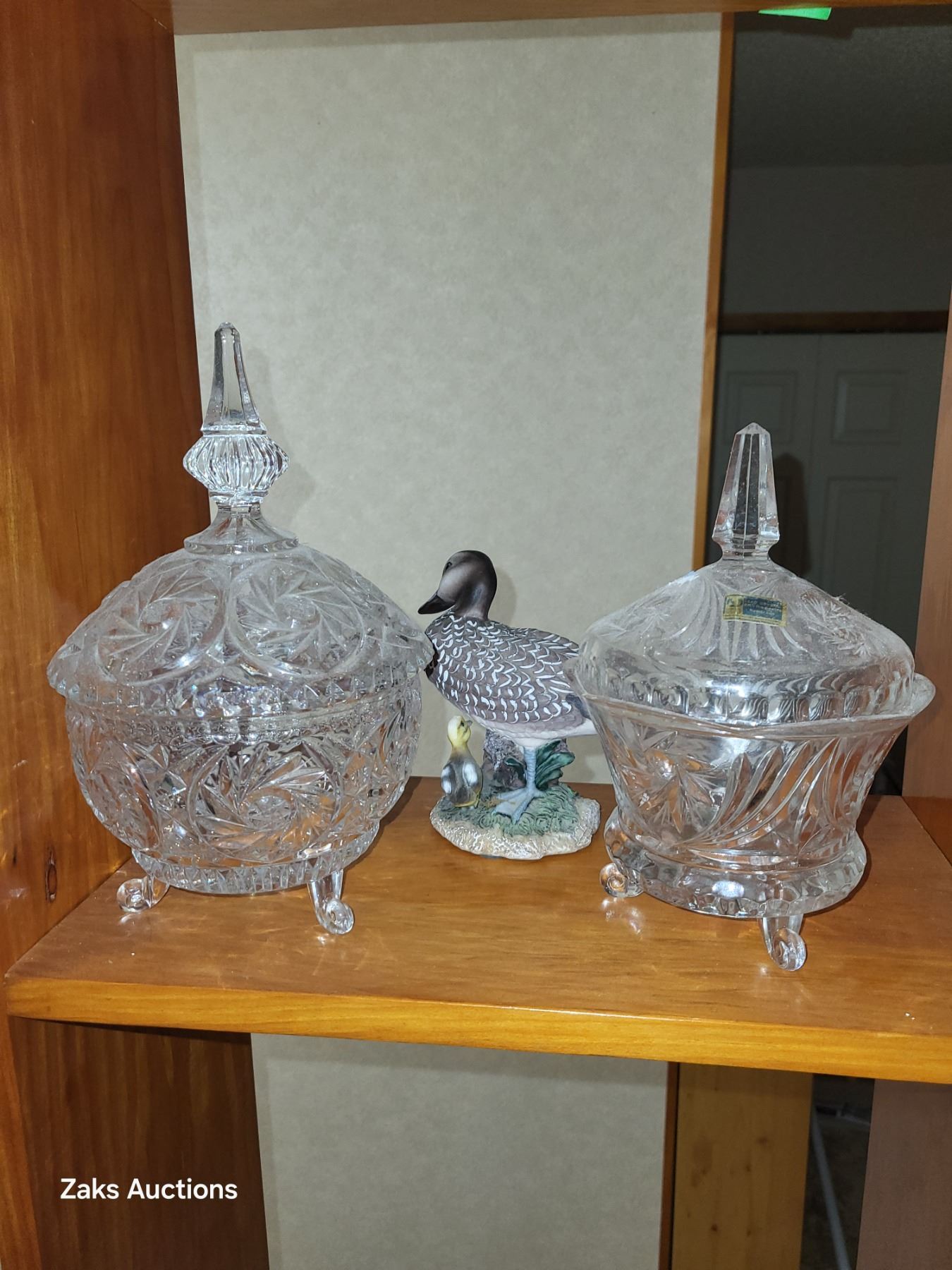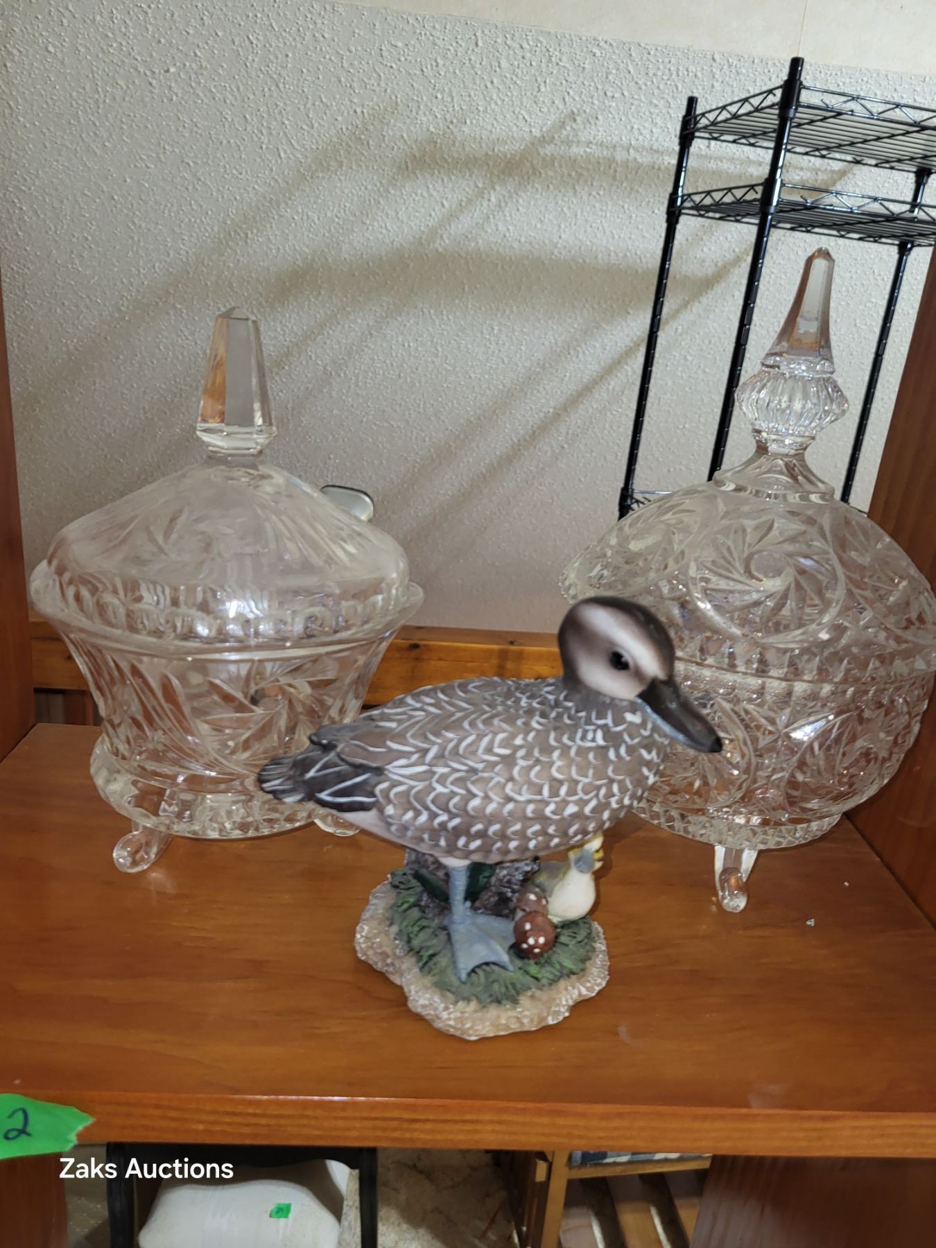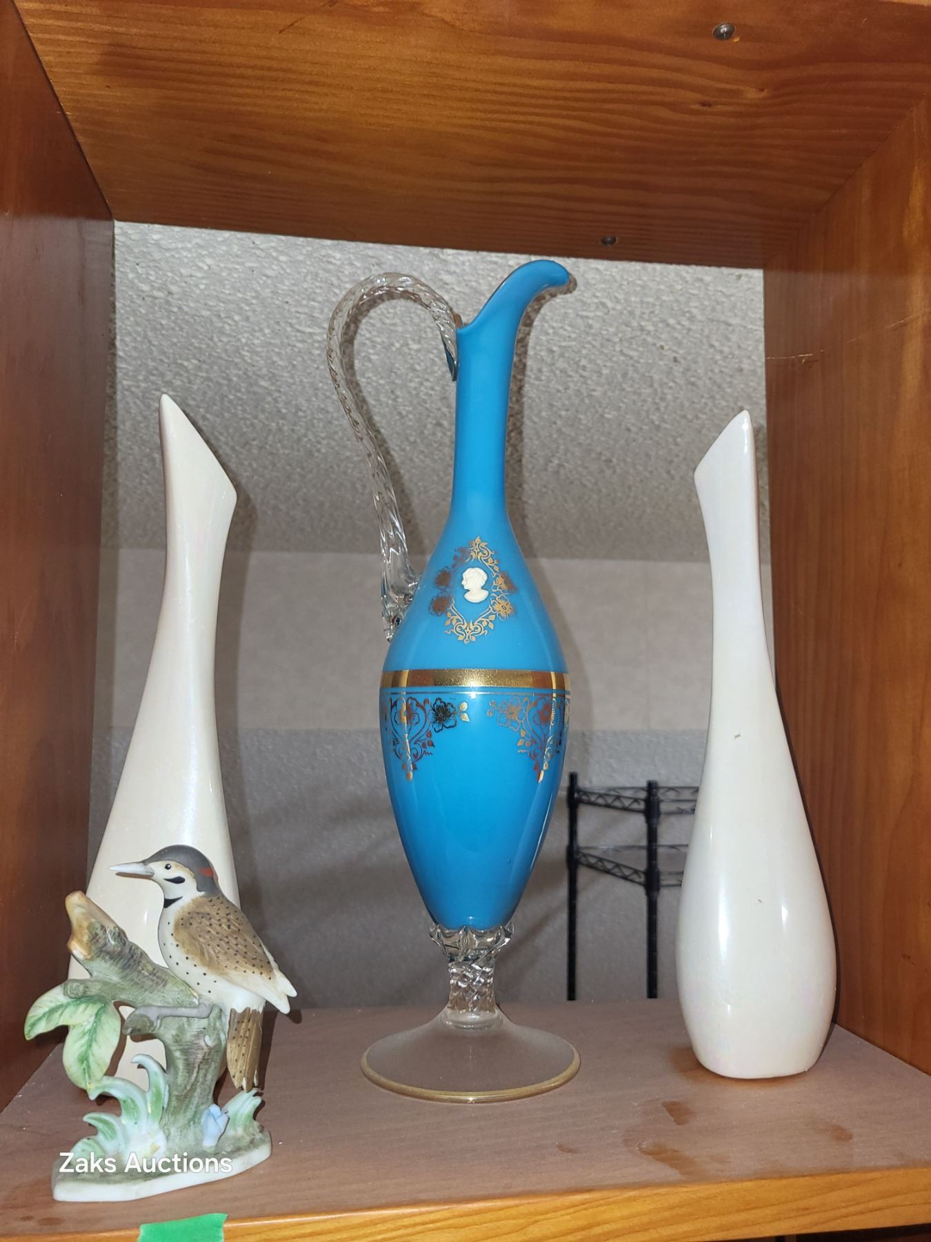 Contents of 3 Shelves - Copper Kettle, Ducks, Crystal + Mid Century Vases + Flicker Japan Bird