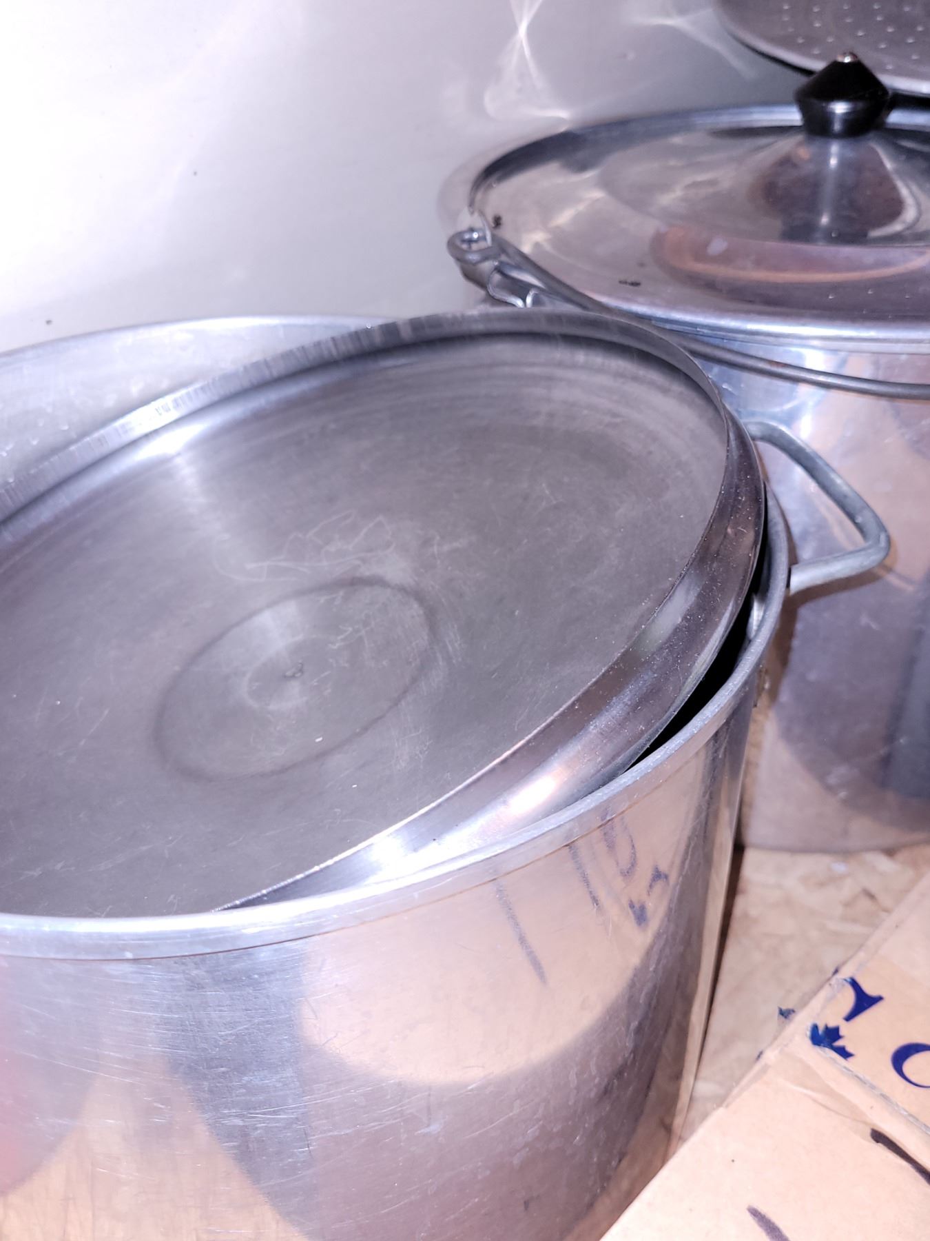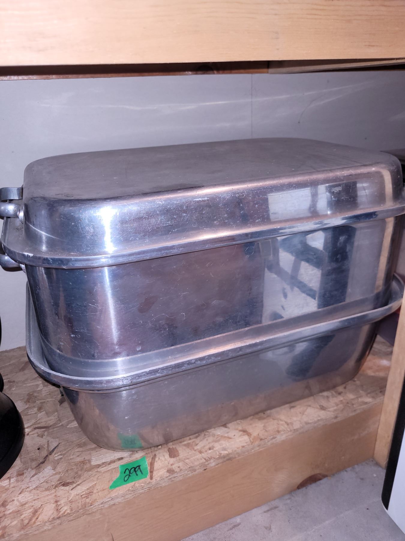 Contents of Lower Shelf - Vintage Cookware, Includiing Double Roaster & Few Stock Pots