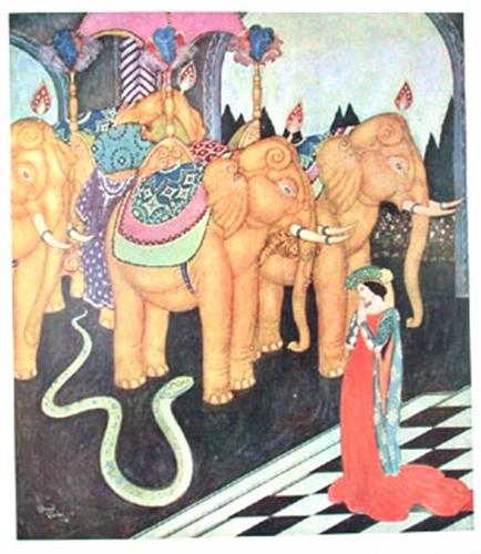Contes et légendes des Nations alliées. Recueillis et illustrés par Edmond Dulac. Paris, Piazza, ( 1917). In-4°. Relié par G. G. Levitzky : plein maroquin janséniste zinzolin, dos à nerfs, doublures de soie moirée améthyste à cadres de même maroquin sertis de filets dorés et listels de maroq. vert olive, gardes volantes de même soie, doubles gardes de papier marbré, tête dorée, couv. illustrée et dos cons.