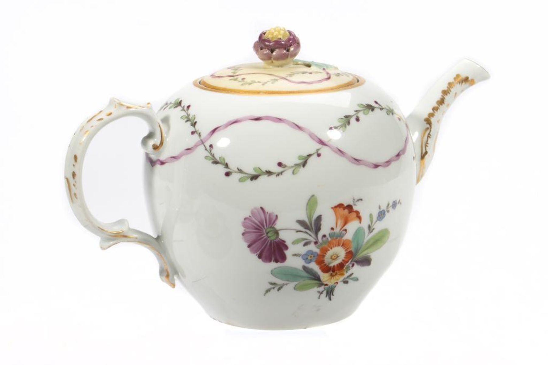 Including a tea pot, creamer, two cups and two bowls all decorated with delicate floral meander. Greatest height 6in. Condition: Teapot lid possibly associated, but good fit. small chip to interior rim of teapot