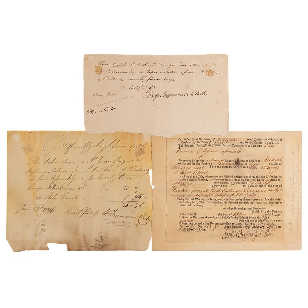 American soldier, lawyer, and politician (1755–1838) who was wounded during the Revolutionary War and later represented Connecticut in the House of Representatives. Manuscript DS, signed "Wm. Edmond, Clerk," one page, 7.75 x 6.5, June 3, 1796, approving a payment to James Rogers for his attendance at the General Assembly. In very good condition, with dampstaining, chipping to edges, and two small tape stains.