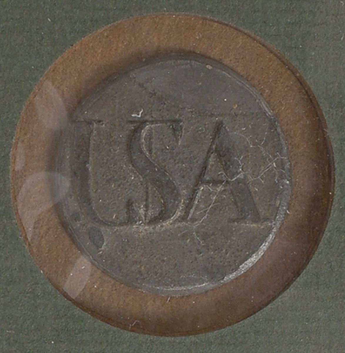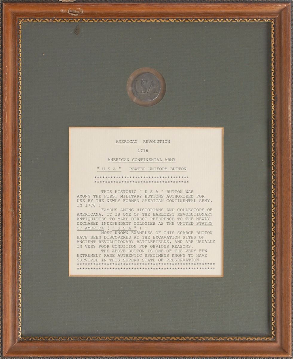Pewter French-pattern Continental Army large coat-sized button, measuring 27mm in diameter, with an intertwined “USA” raised in relief on the face. Matted and framed with a description to an overall size of of 10.75 x 13. In fine condition. These buttons were used on the uniforms of enlisted men toward the end of the Revolutionary War. A highly desirable specimen as an early reference to the ‘United States of America.’