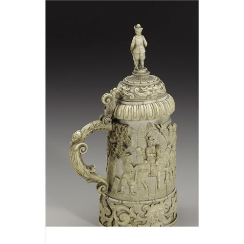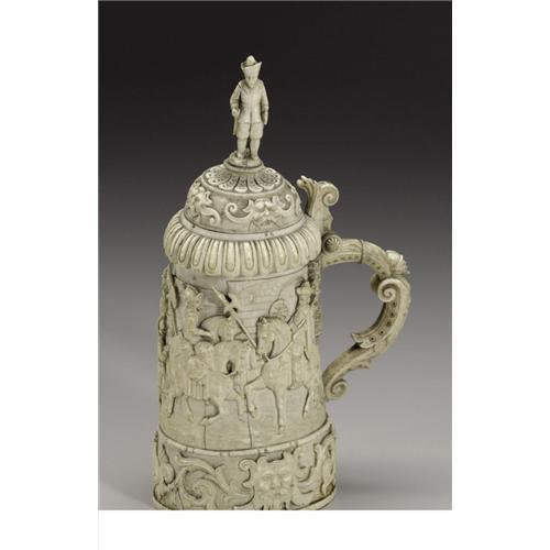 <B>A French Carved Ivory Tankard</B></I><BR><BR>Unknown maker, possibly Dieppe, France<BR>Nineteenth Century<BR>Ivory<BR>Unmarked<BR>8.25 in. high<BR><BR>The tankard depicting a procession of soldiers into a village, above a frieze of masks and foliage, with scrolling foliate and term handle, all surmounted by a dome hinged cover with masks and a soldier finial1 <BR><BR><B>Condition Report:</B> Normal signs of wear as appropriate with age, old repairs, cracks and small losses, possible marriage