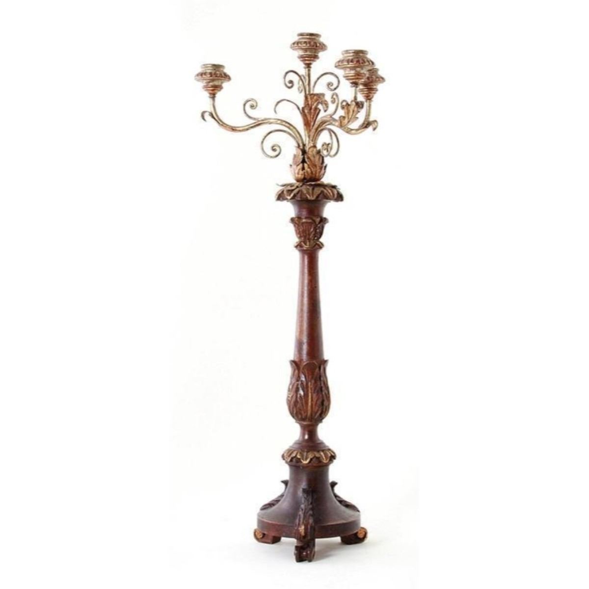 Continental parcel-gilt carved wood four-light candelabrum, late 19th/early 20th century, acanthus-laden column supporting scroll and foliate arms ending in bobeche. H29in Provenance: Estate of Irl Paul &Barbara Middleton, Atlanta, Georgi