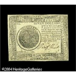 Continental Congress Issue September 26, 1778 $7 About <B>Continental Currency September 26, 1778 $7 Counterfeit Detector Choice New.</B></I> A fully uncirculated example without any problems of any kind. These blue paper notes were produced to be distributed to merchants. They were printed from the genuine plates and could be used for comparison with suspected fraudulent notes. The purpose of the blue papers was to prevent individuals from falsely signing and circulating the notes. This particular example has the words "Proof Sheet" written in the signature block. <BR><BR><B>Important notice:</B> Heritage usually auctions material at the rate of 200-250 lots per hour. On some occasions eBay Live bid software or the Internet may not be able to keep up with the pace of the auction. We recommend placing a realistic absentee bid now as insurance to avoid disappointment. Occasionally the auctioneer may eliminate or reject an eBay Live bid, and the auctioneer may also reopen a lot after the close of the eBay live bidding (usually because we missed an audience bid), and may reject your bid even if it shows you as the winning bidder. By bidding via eBay Live, you agree that Heritage may award the lot to another bidder at its sole discretion under the circumstances described above or any other reasonable circumstances. Since eBay bids are not shown to us until we open the lot on the floor, we treat those bids just like floor bids. In most cases the floor responds before the eBay bid is presented to us, due to Internet lag time, so for consistency we have made it a policy that floor bids are always considered first over tie eBay live bids. Also please note that all Heritage lots purchased through eBay Live carry a 20% Buyer's Premium. Please make sure you read the Terms and Conditions before you bid. This lot is being auctioned in conjunction with a live floor auction by Heritage Galleries & Auctioneers. All final auction and invoice information will be supplied by Heritage Galleries & Auctioneers, and all other information should be considered preliminary. Lot:15059